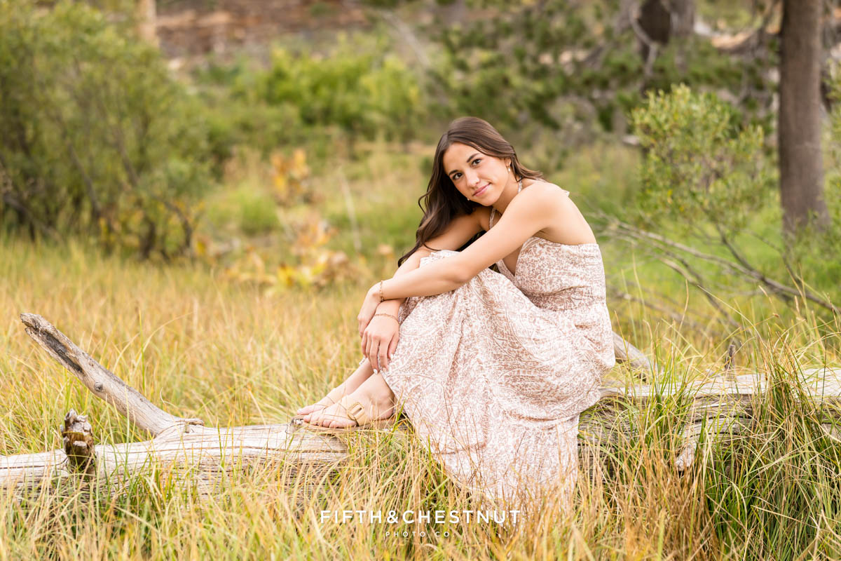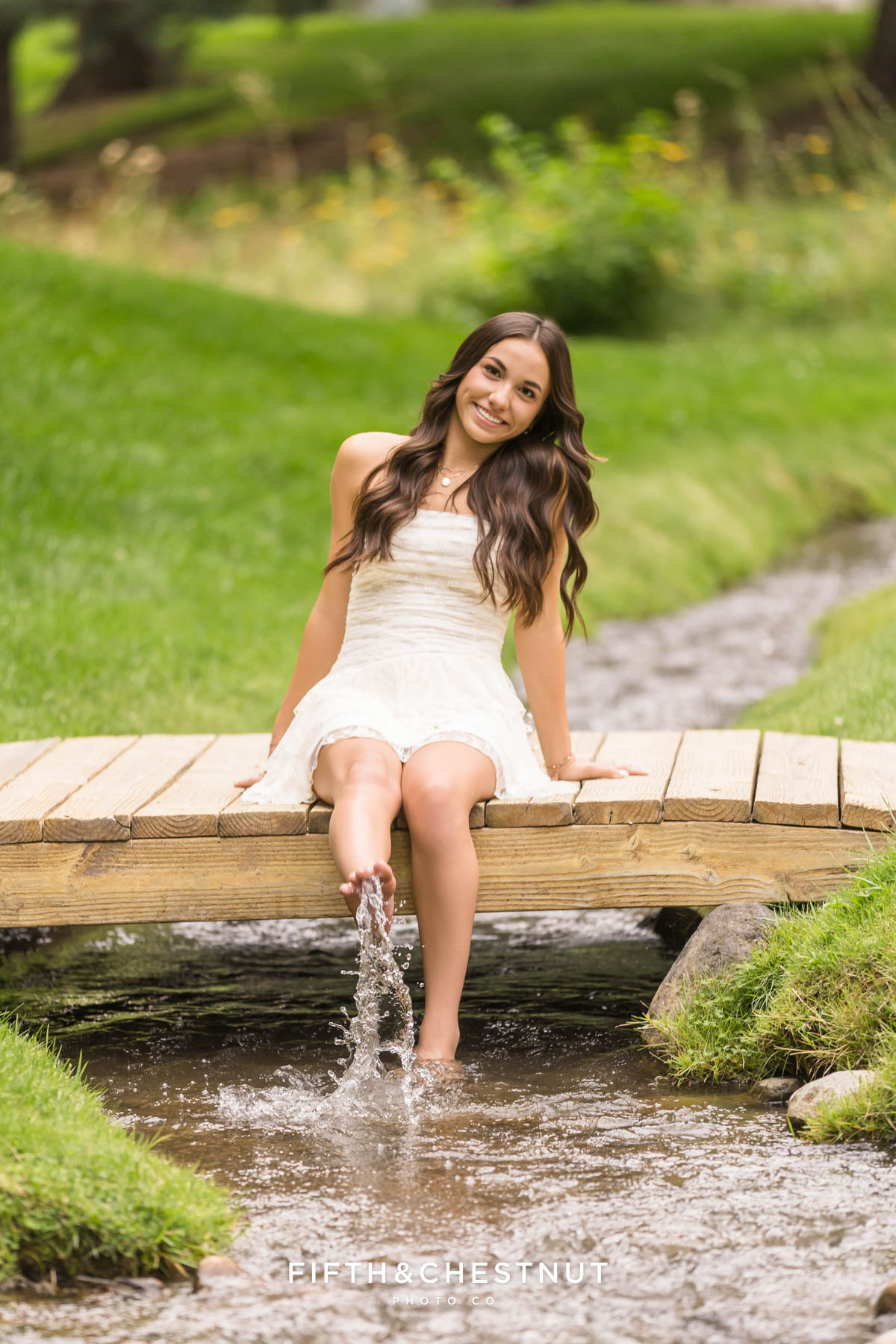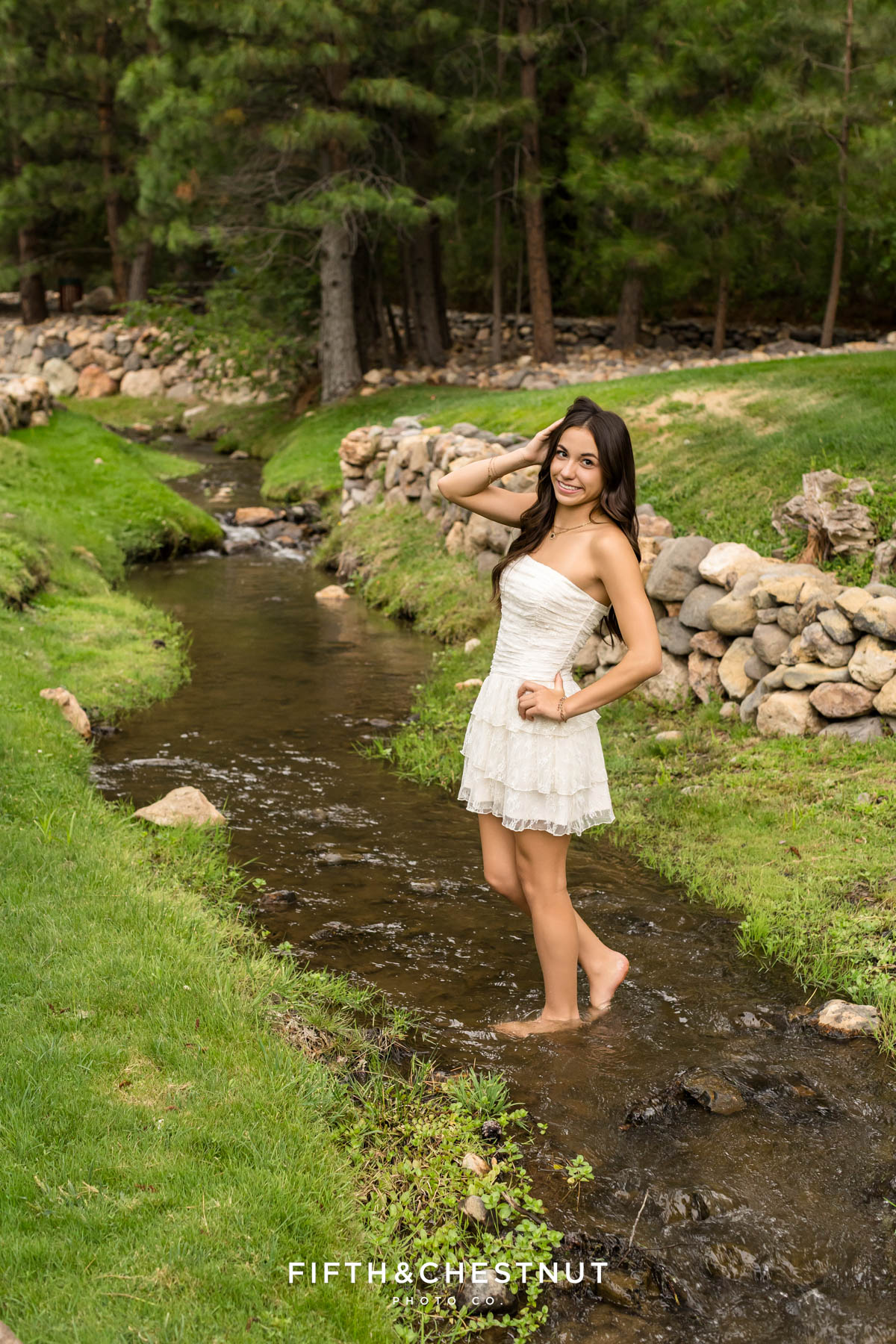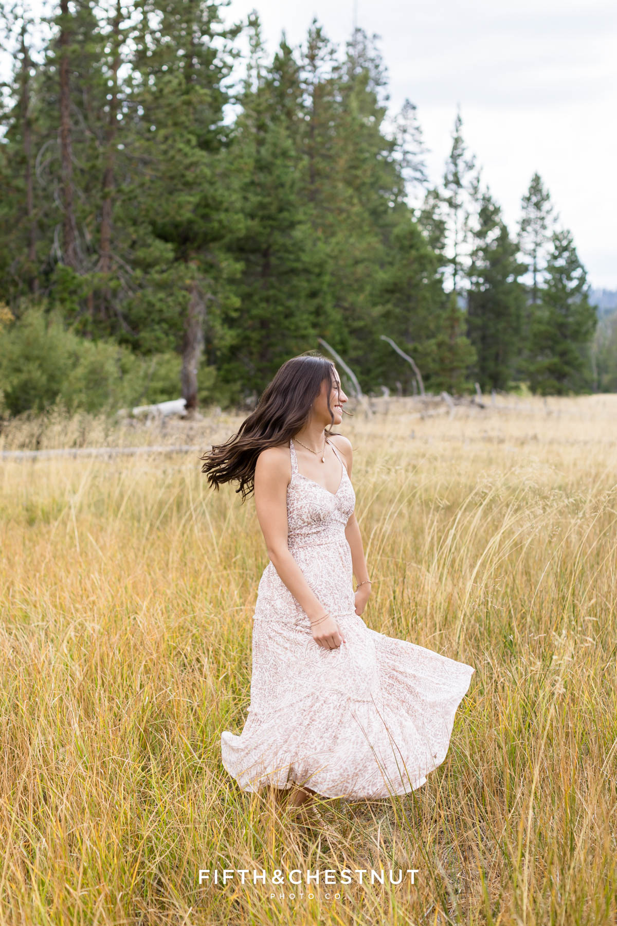 Aliya’s summer senior portraits in Tahoe was an event to remember! We started at the lush and vibrant Caughlin Ranch Ponds in Reno. The green grass and peaceful creeks created a dreamy summer backdrop. Although rain was in the forecast, we crossed our fingers and hoped for the best. Sure enough, just as we arrived, it started raining. Luckily, the rain stopped quickly, and we were able to kick things off with some beautiful portraits in the greenery.