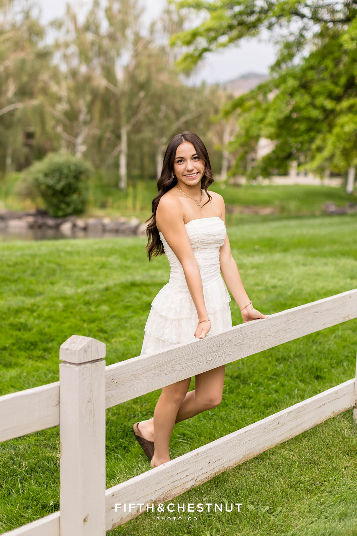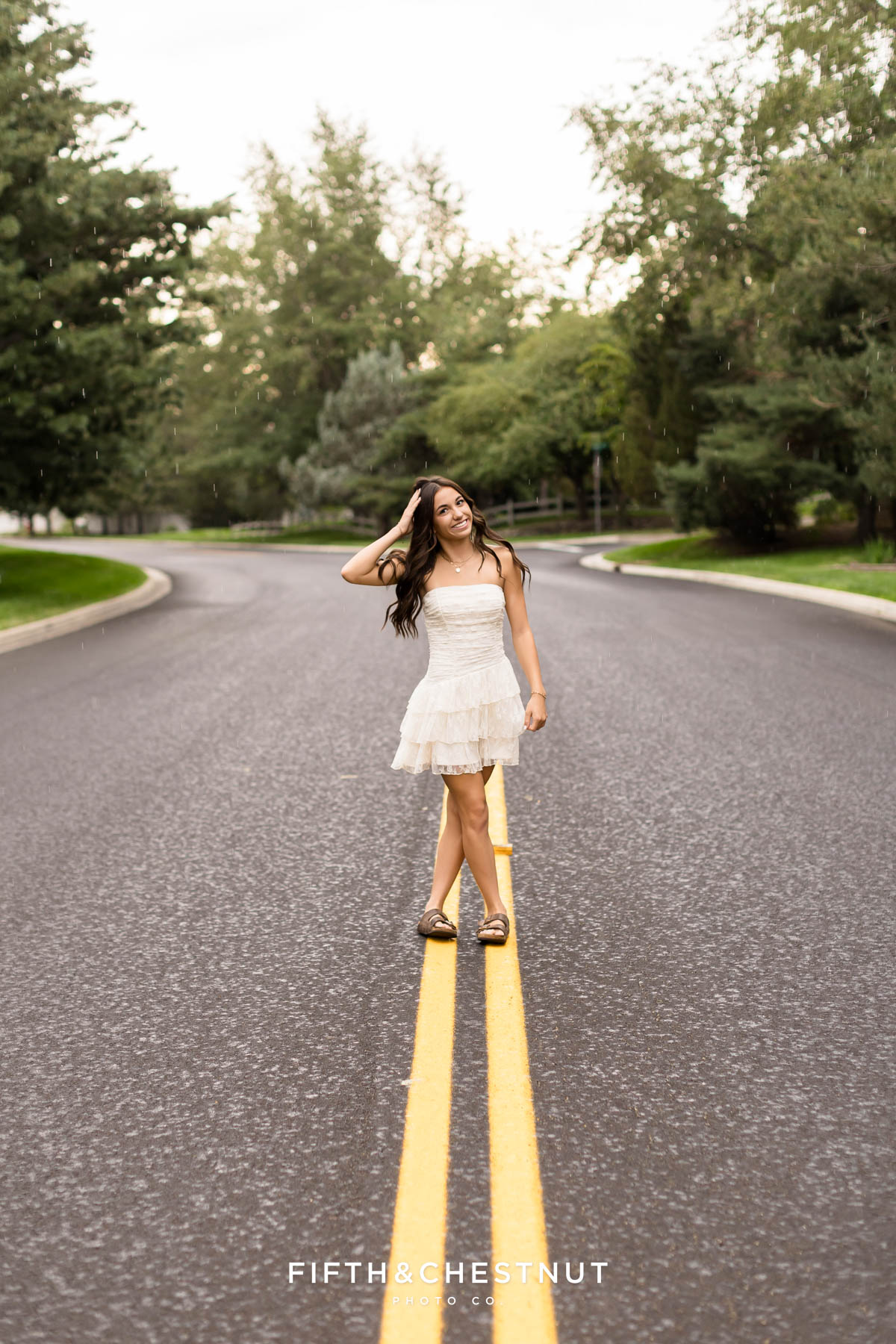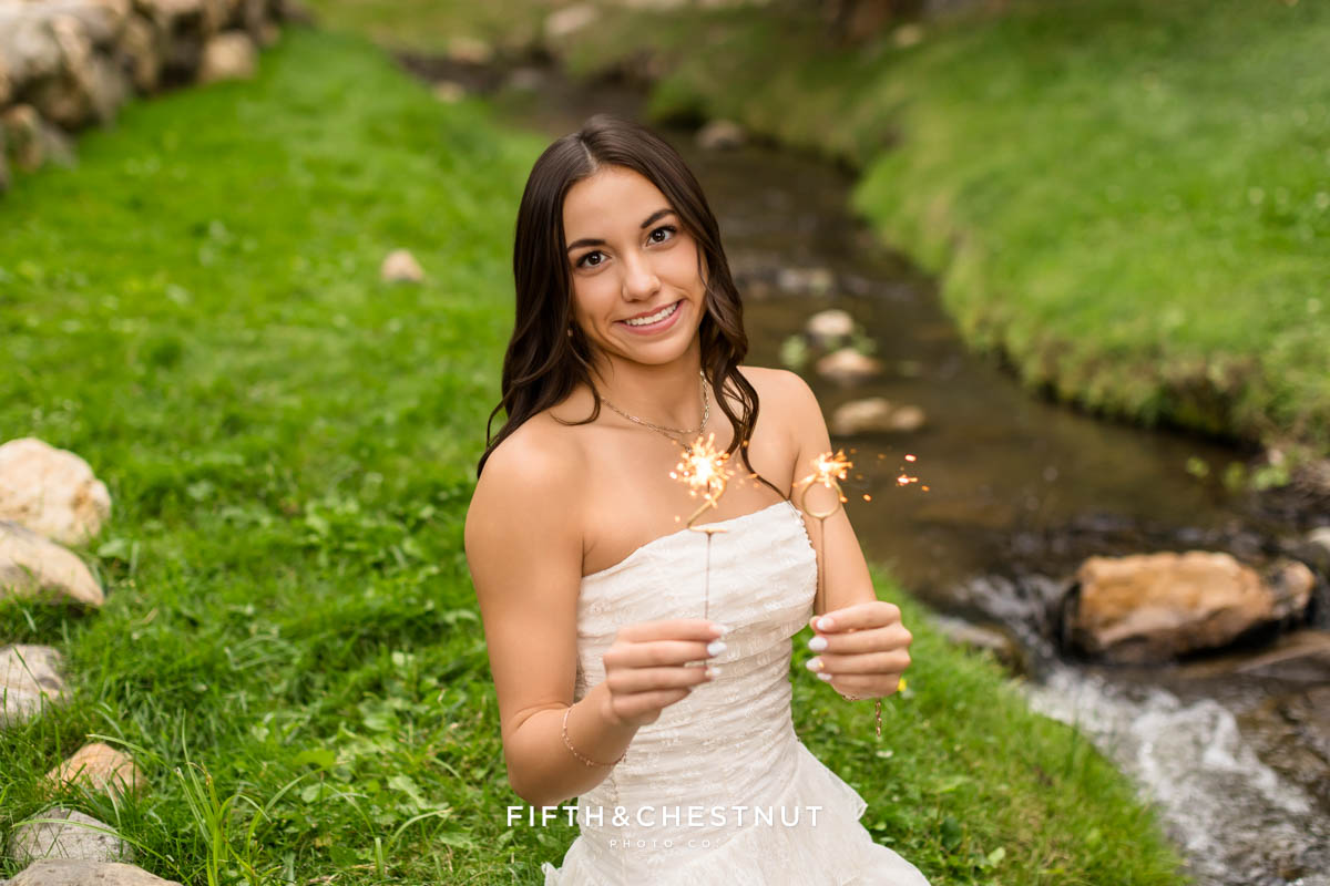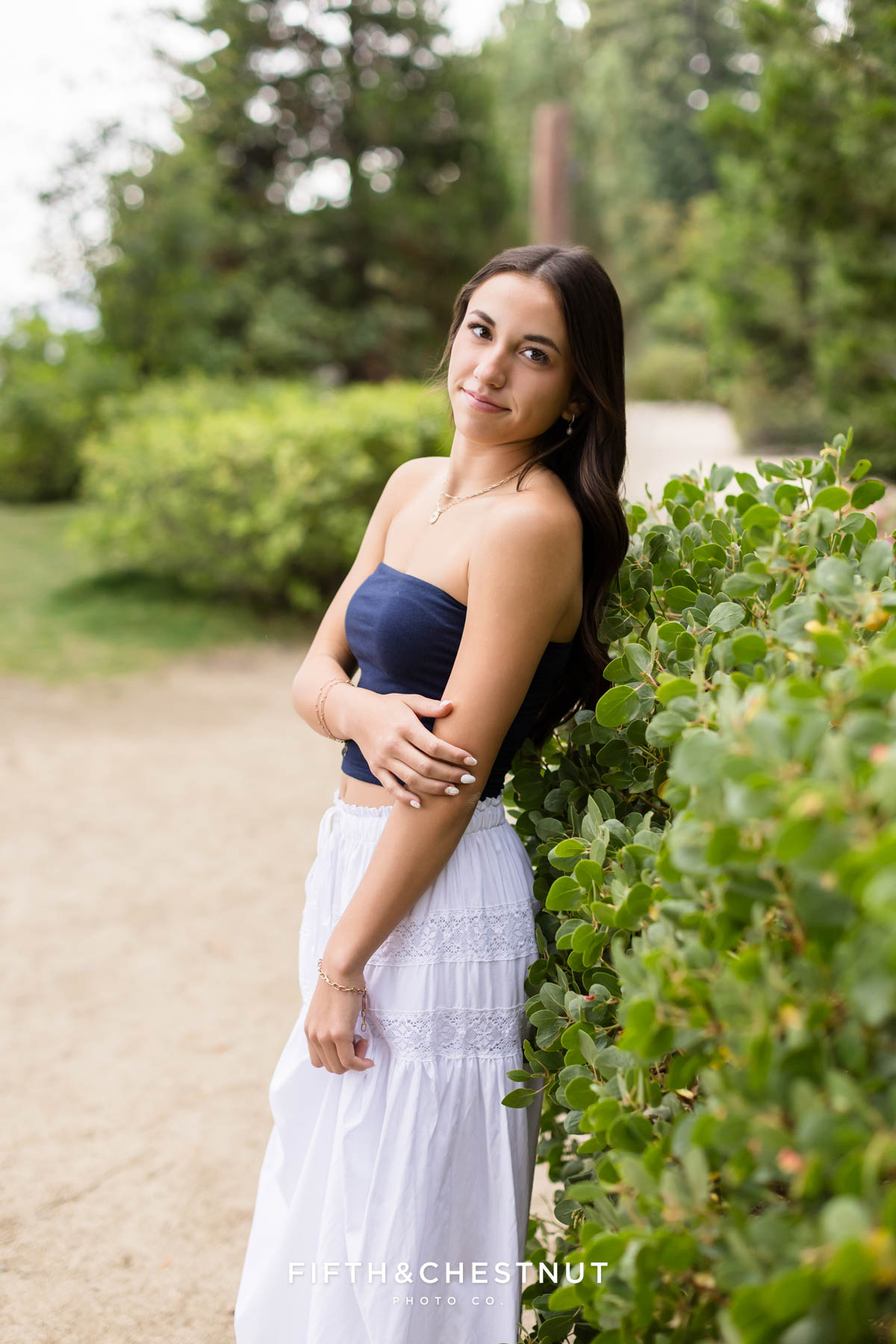 Aliya’s summer senior portraits in Tahoe was an event to remember! We started at the lush and vibrant Caughlin Ranch Ponds in Reno. The green grass and peaceful creeks created a dreamy summer backdrop. Although rain was in the forecast, we crossed our fingers and hoped for the best. Sure enough, just as we arrived, it started raining. Luckily, the rain stopped quickly, and we were able to kick things off with some beautiful portraits in the greenery.