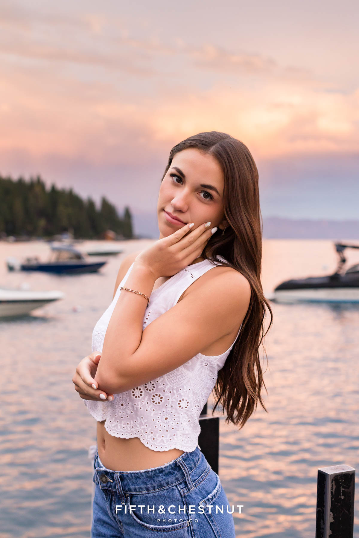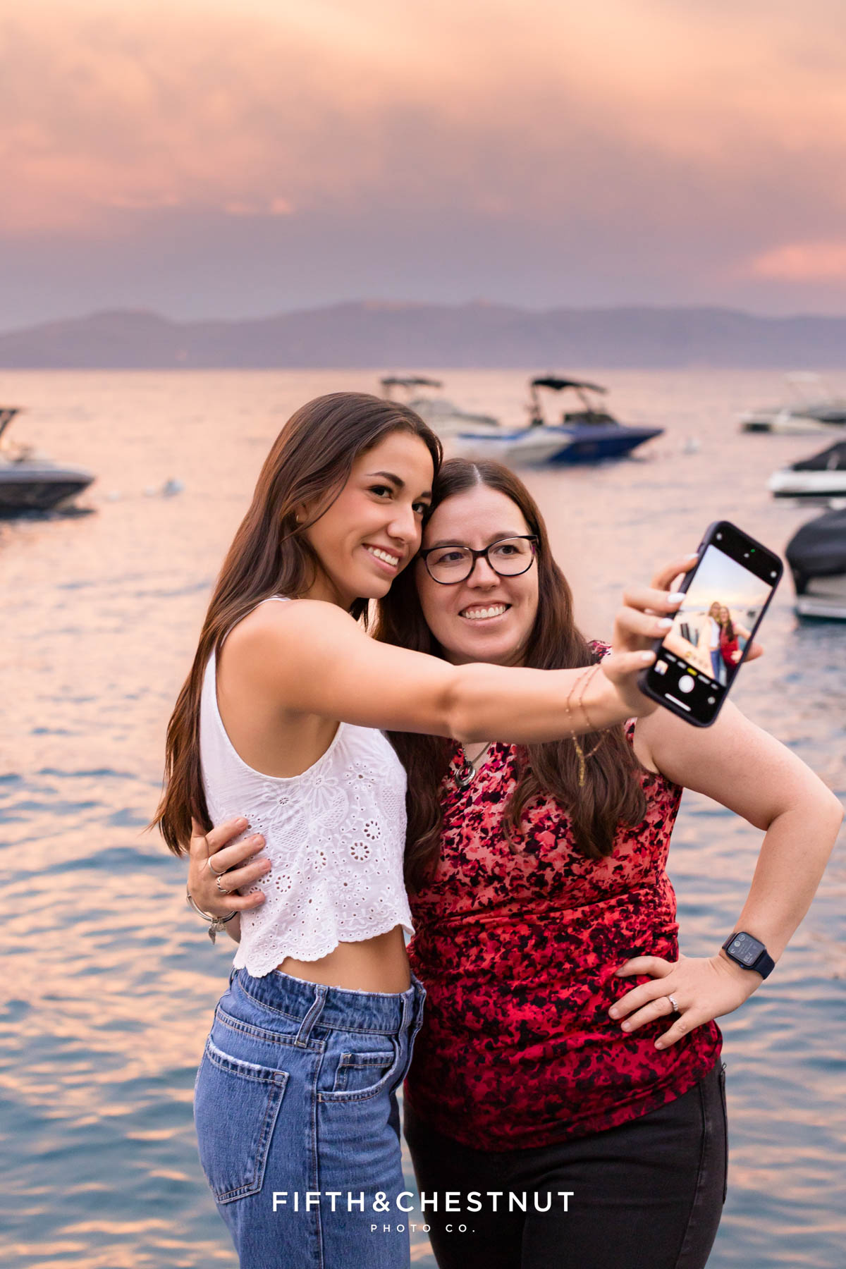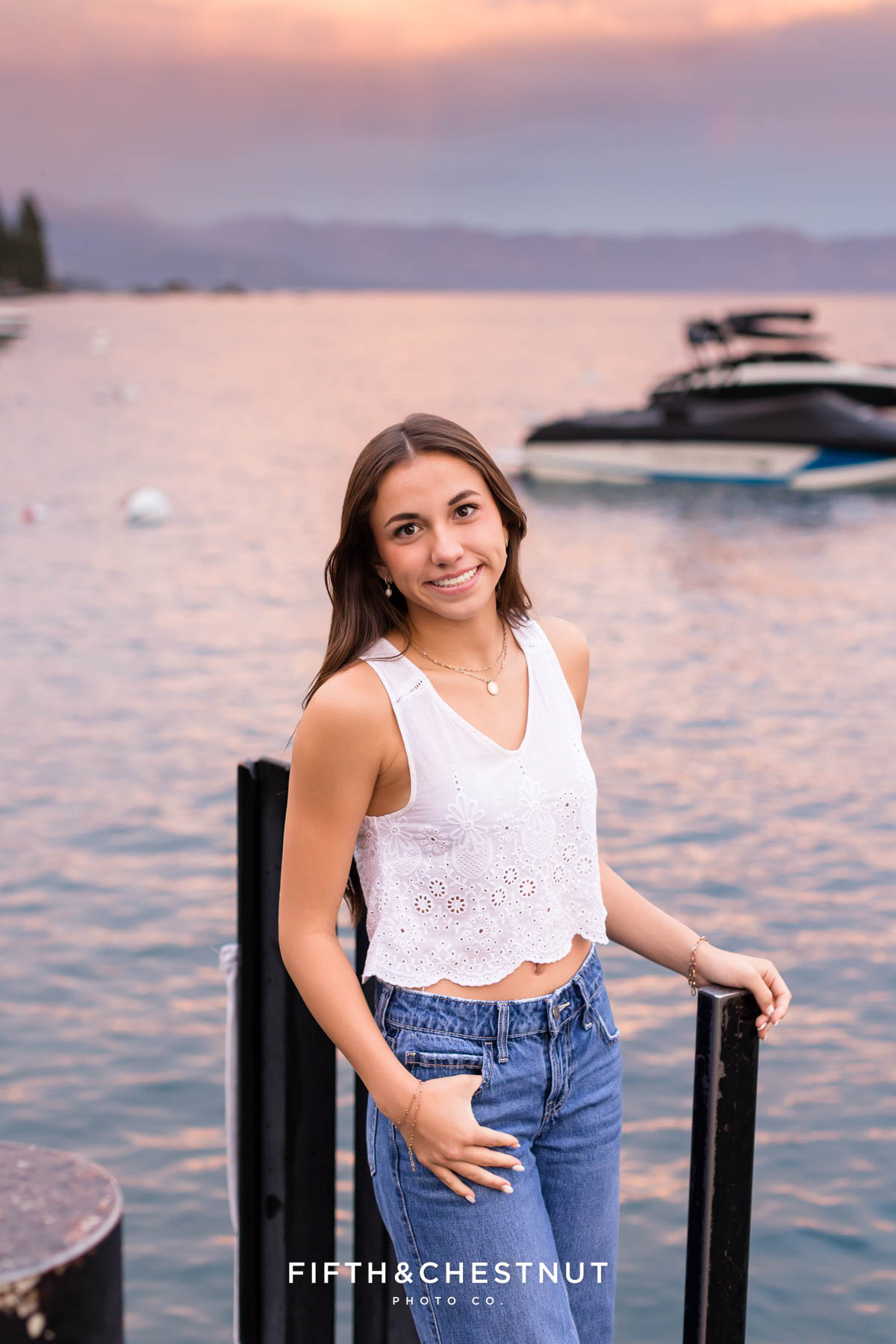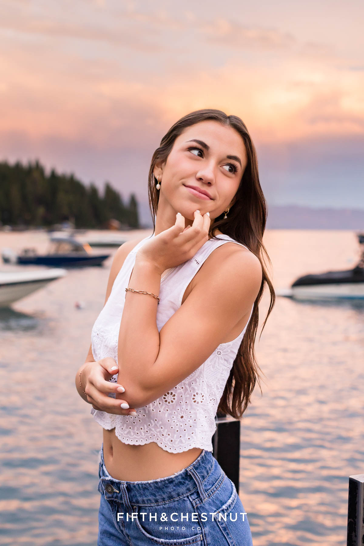To wrap things up, we visited the family’s beach spot in Tahoe City. It’s a stunning location with flowers, soft grass, a rocky beach, and charming piers – so perfect for senior photos. And just when we thought the session couldn’t get better, the stormy skies gave us the most epic sunset over the lake. The clouds lit up with soft pinks and oranges, giving us a golden glow to finish the evening. It felt like a little reward from the universe after the rollercoaster weather.