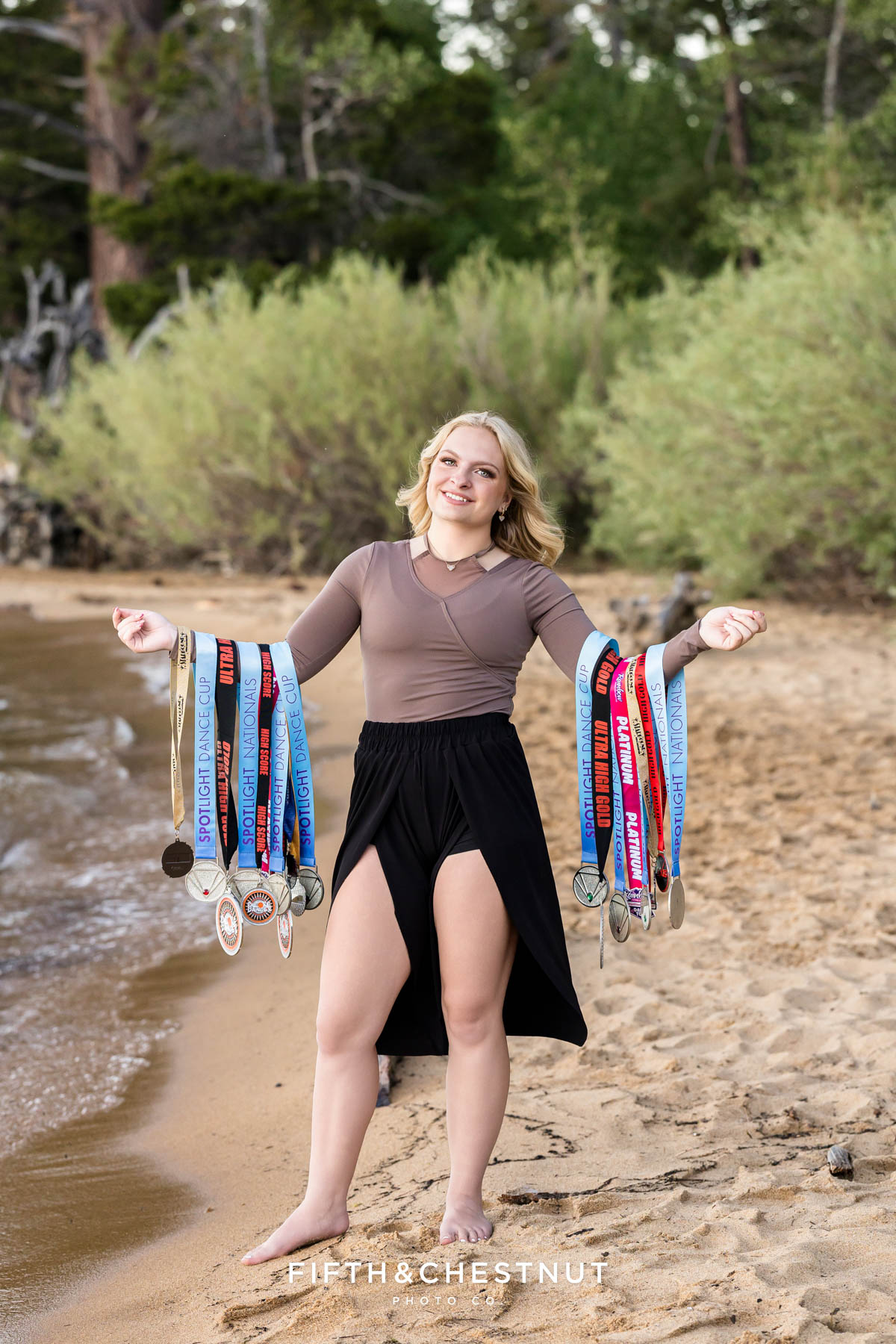 At Kiva Beach, we switched gears to highlight Natalie’s many accomplishments. She brought all of her impressive dance medals to show off. I was blown away by how many she has earned. It was so fun to photograph her walking barefoot along the shoreline with those medals draped on her arms, in her simple, but elegant, dance outfit. Her joy and pride really shined through.