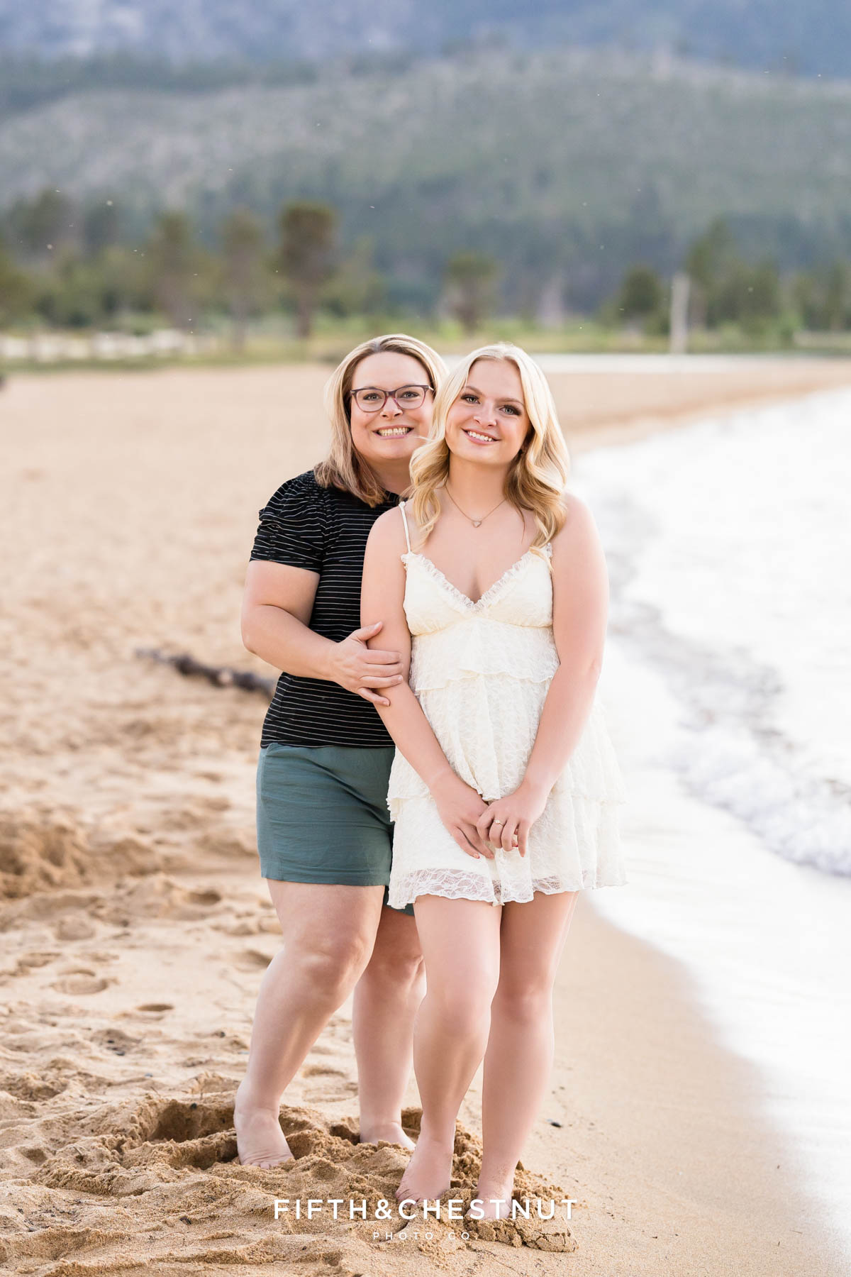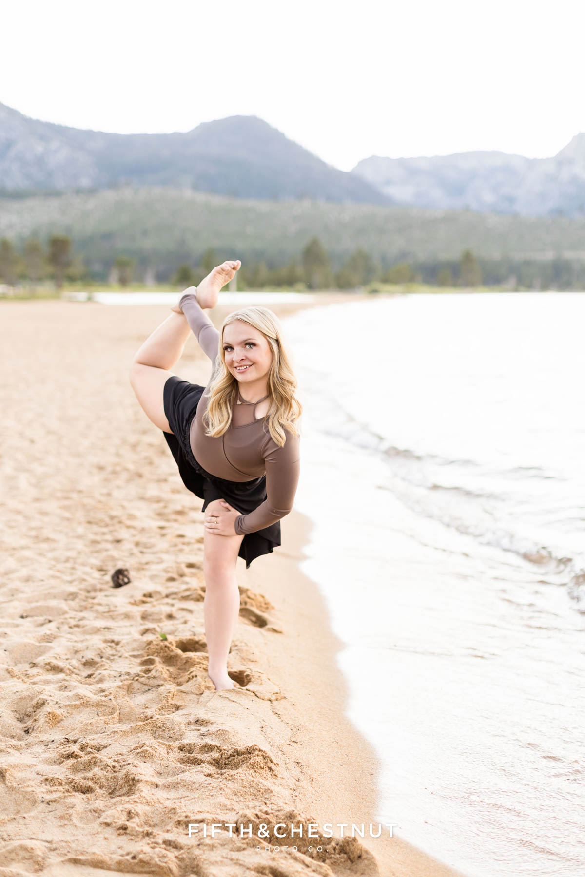 We also captured some cheer portraits in her North Valleys High School uniform. She posed on the beach with her custom cheer box and pom poms. The lake was calm, and the skies were soft and glowing. It felt like the perfect ending to our session.
