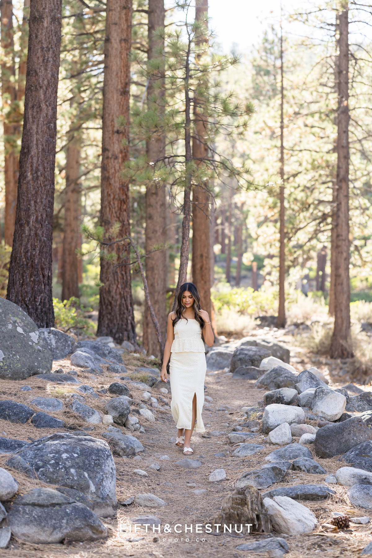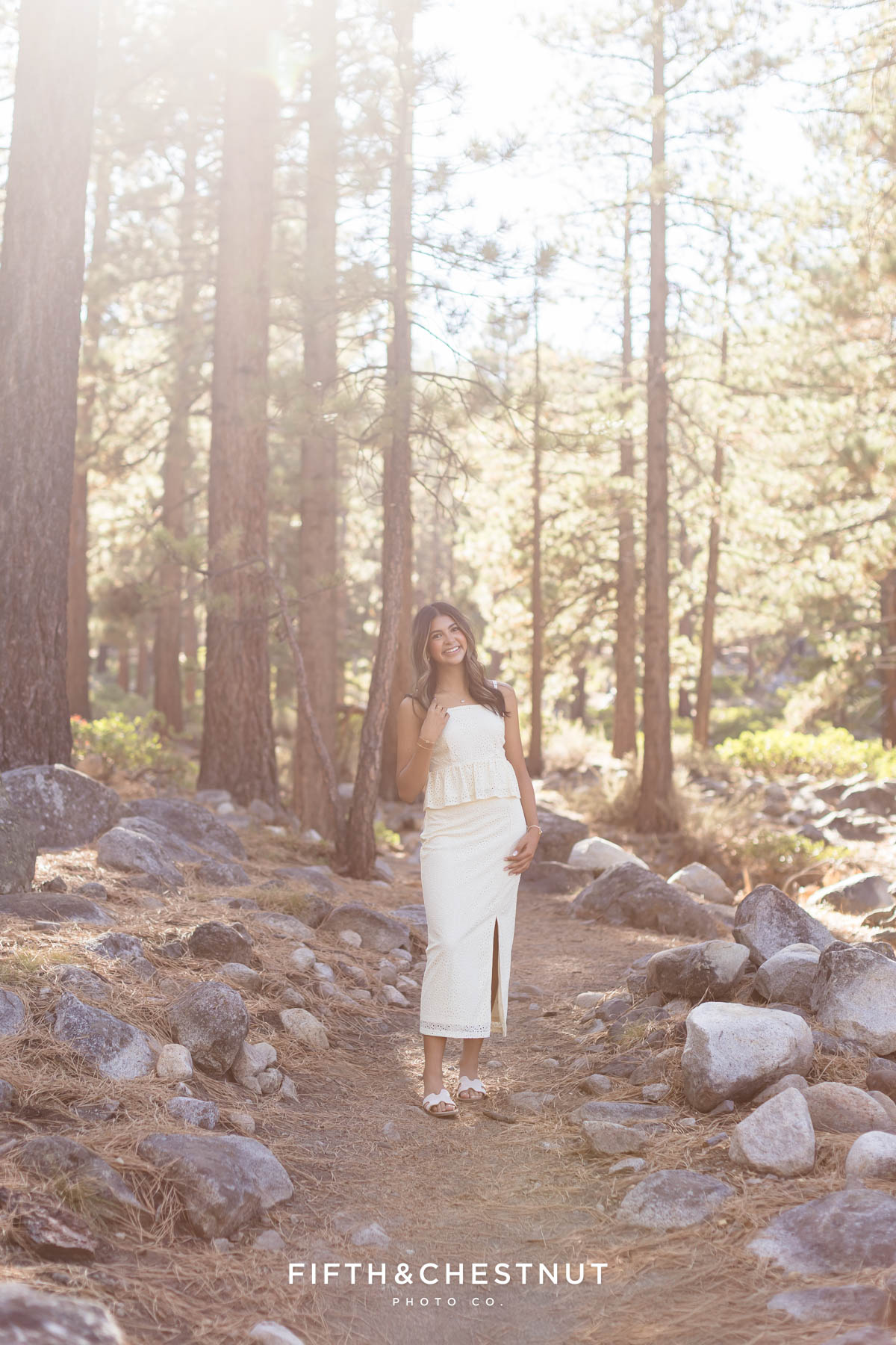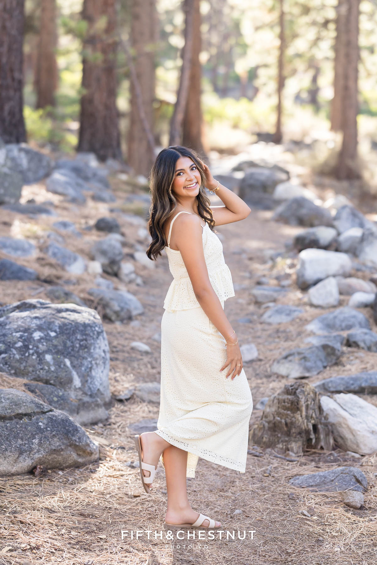 We began Lily’s session surrounded by tall trees and soft forest light. Early fall is such a lovely time for senior photos in Reno because the sunlight filters gently through the leaves.
