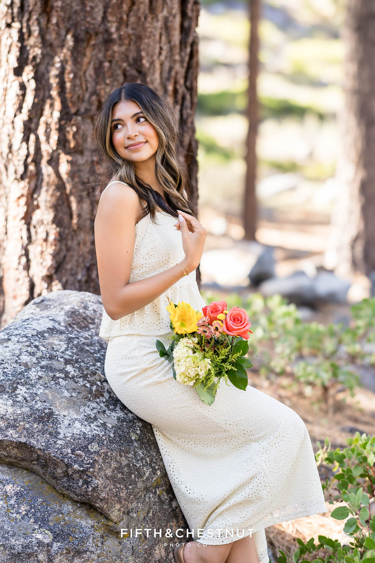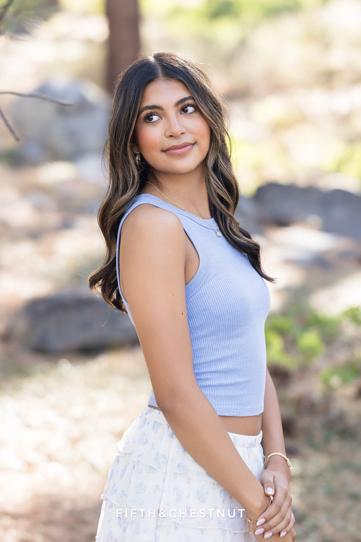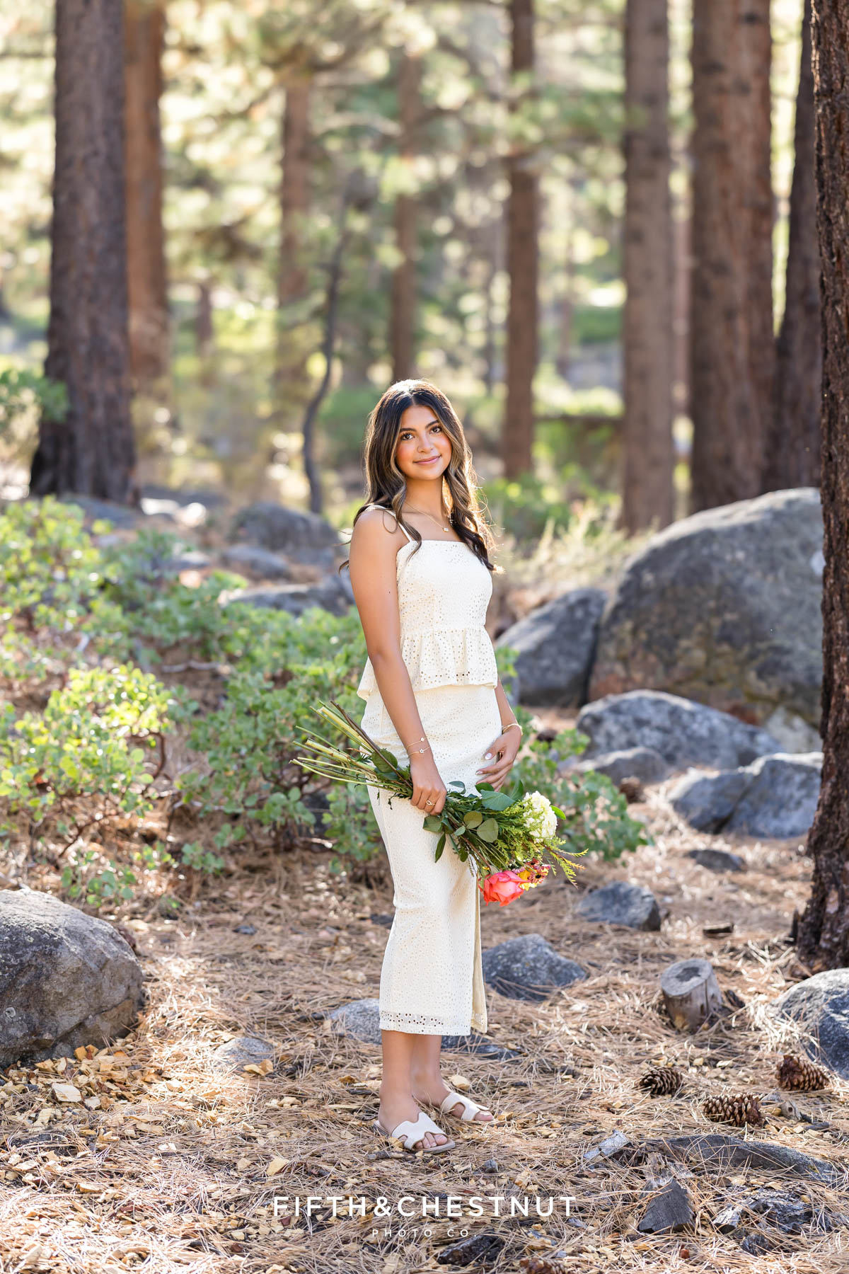 We began Lily’s session surrounded by tall trees and soft forest light. Early fall is such a lovely time for senior photos in Reno because the sunlight filters gently through the leaves.