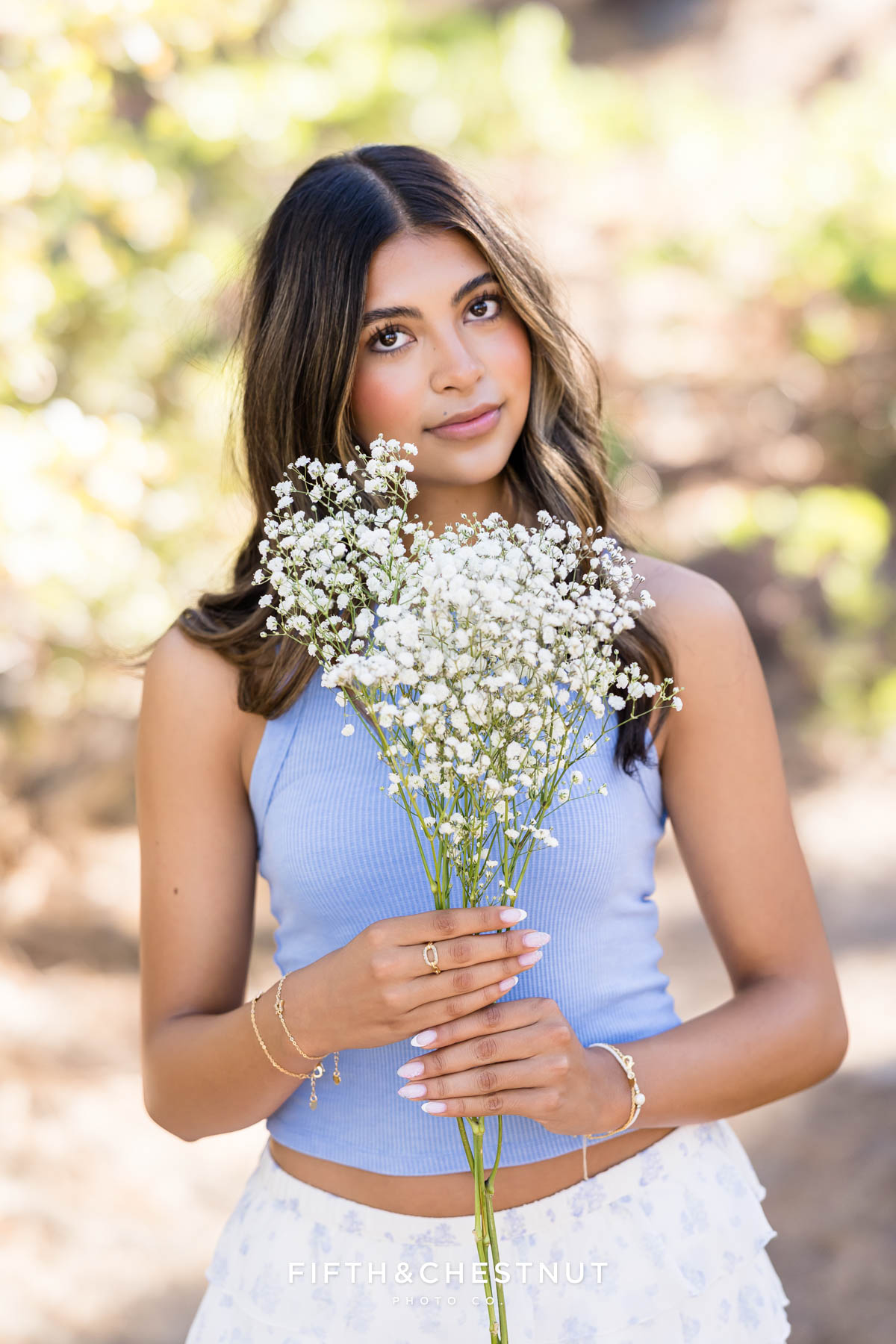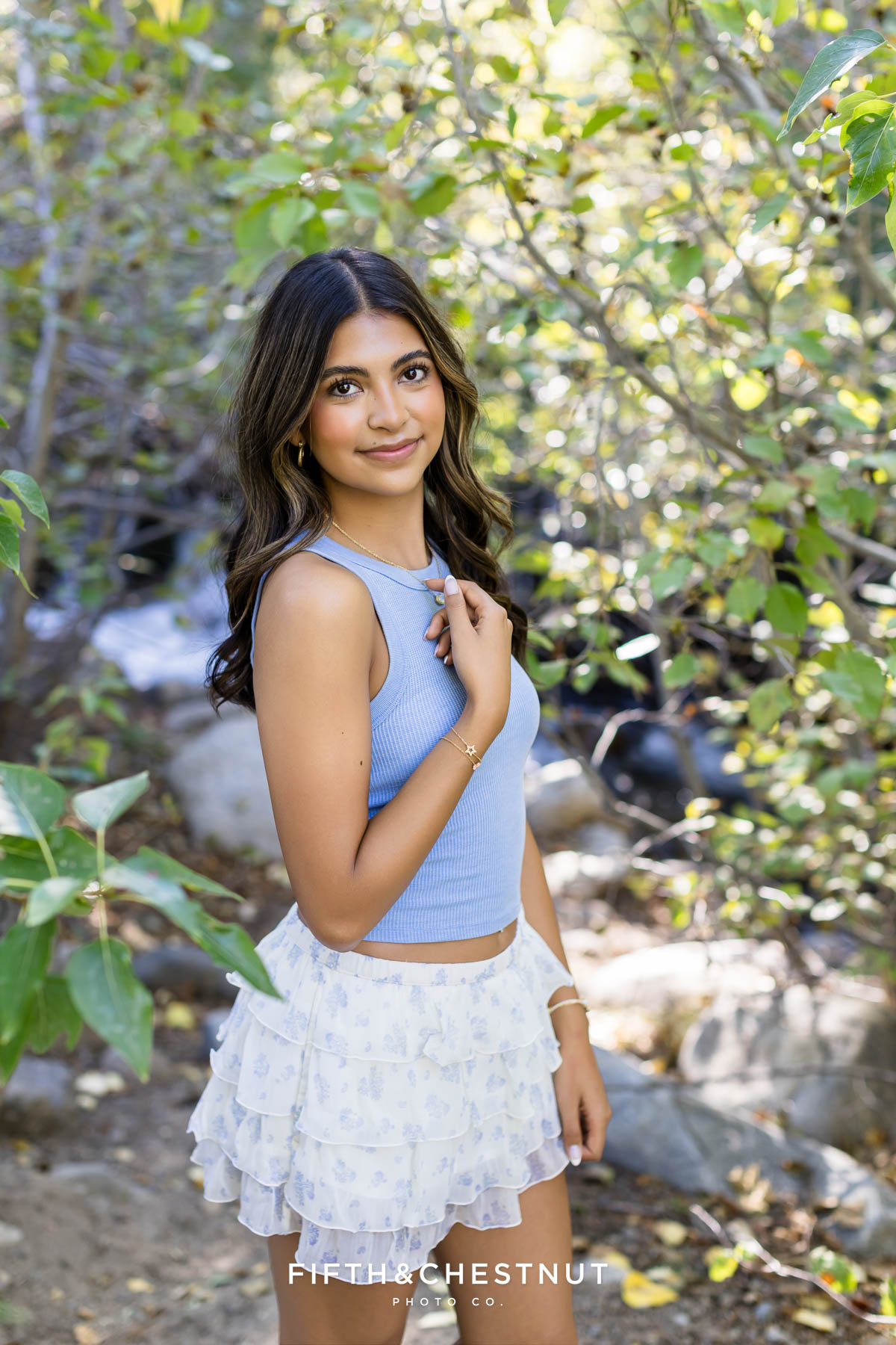 Later, Lily changed into a light blue top and a soft white skirt. She carried delicate white flowers, which looked beautiful in the warm forest light. The look felt playful, relaxed, and perfect for the setting.