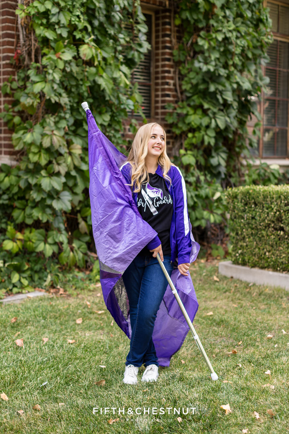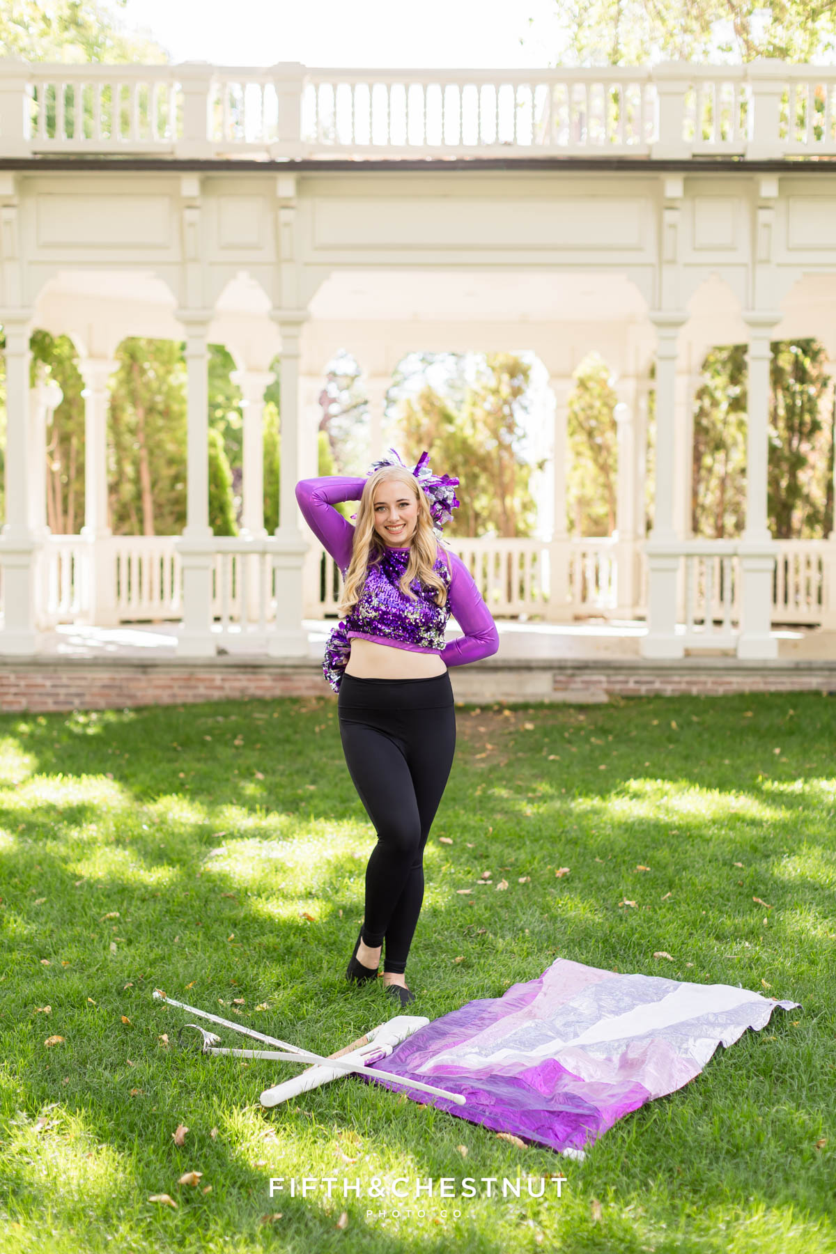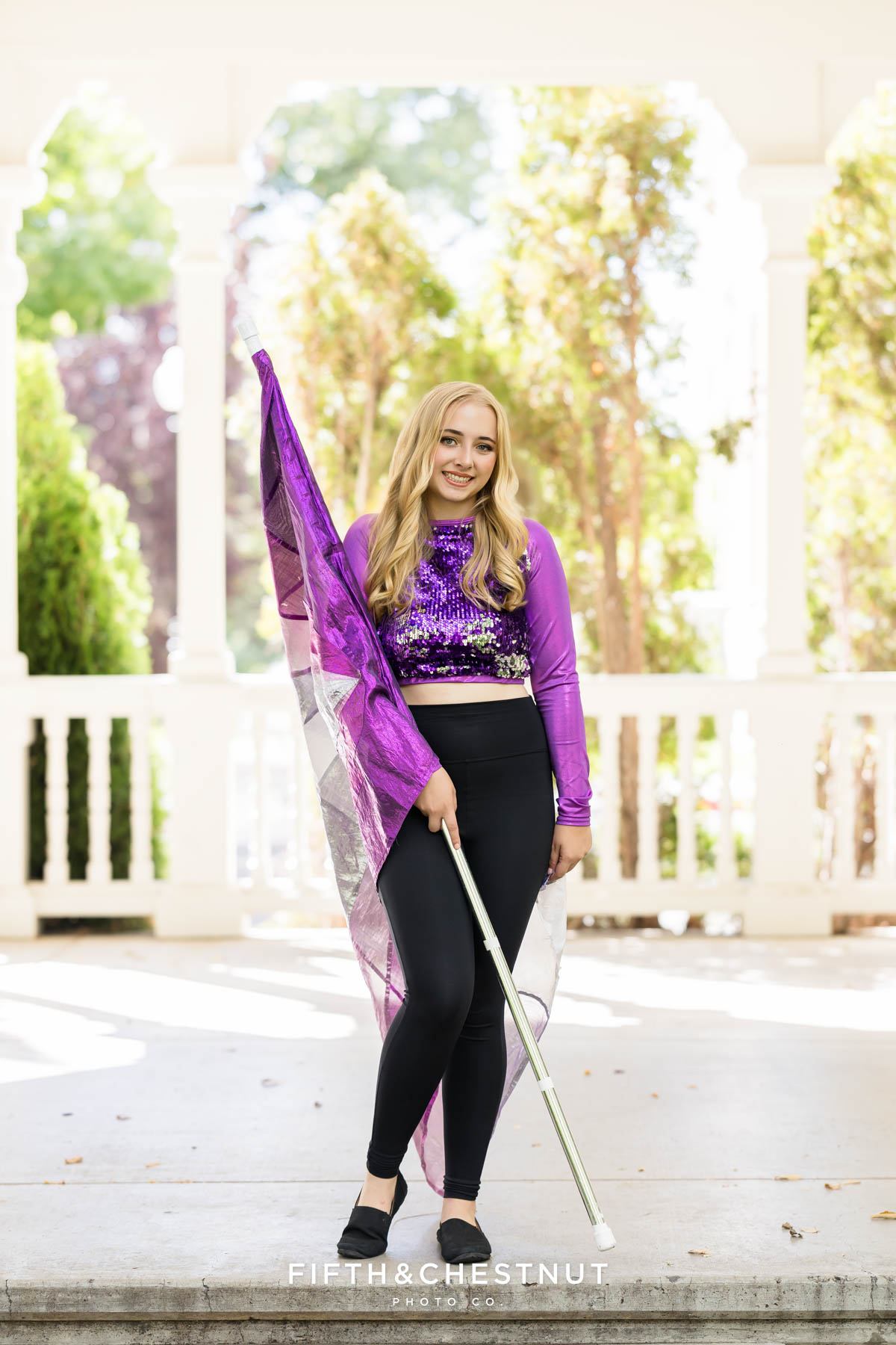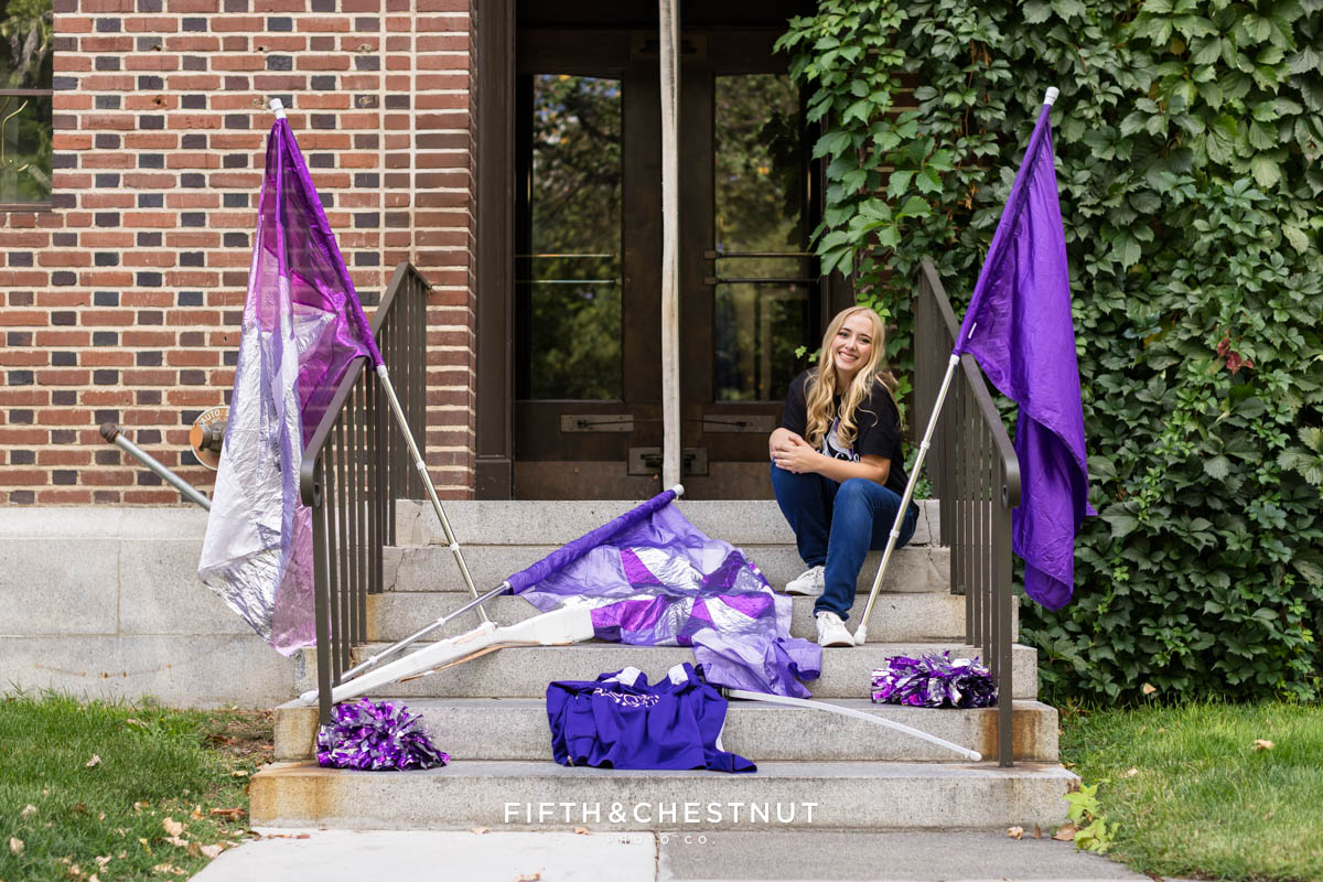 We began Jordan’s Urban Boho Reno Senior portraits on the UNR campus, kicking things off with her Color Guard outfits and props. This part of the session was bold and expressive, and it celebrated something that has clearly shaped her high school experience. The flags, movement, and strong poses made these portraits powerful and full of life.
