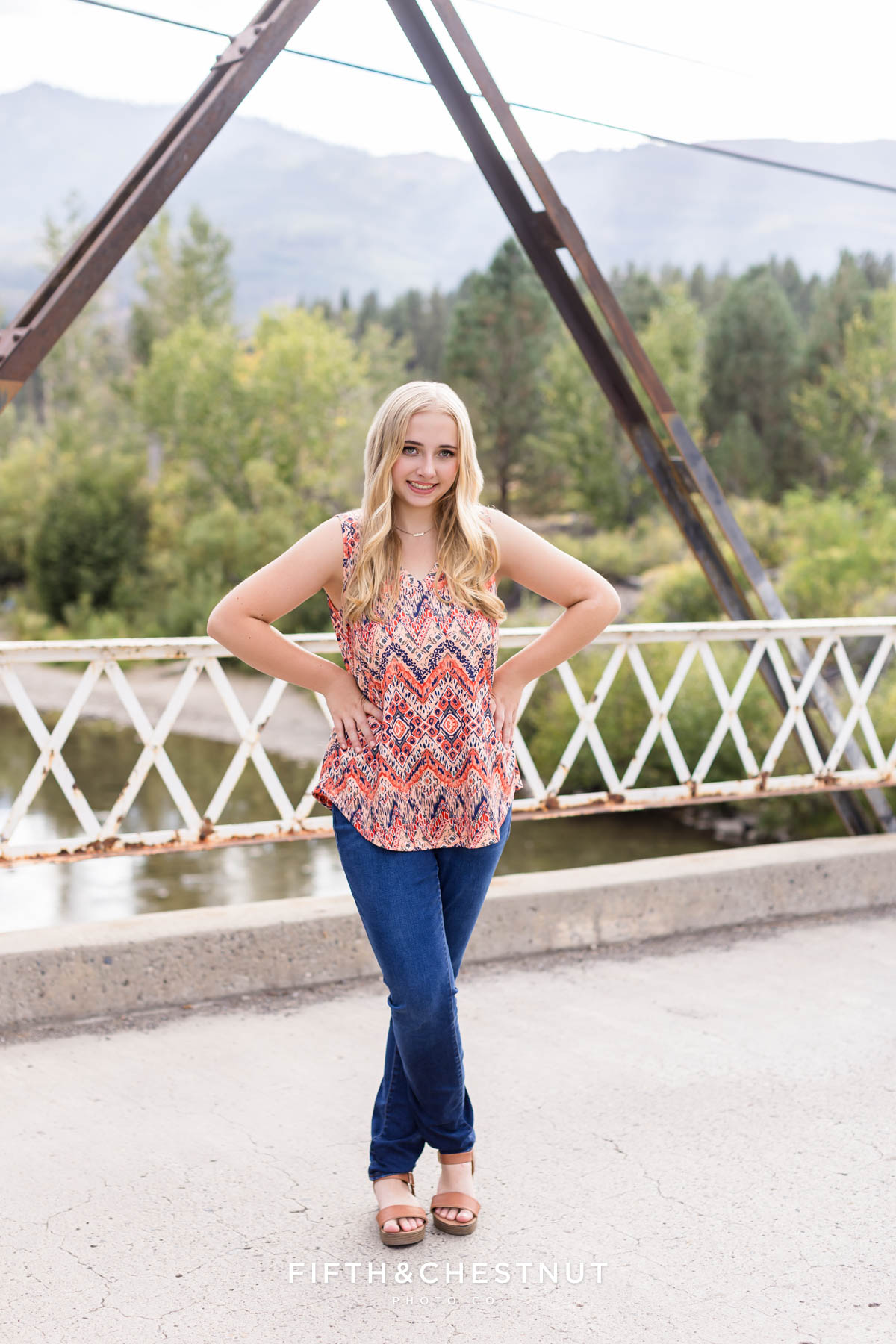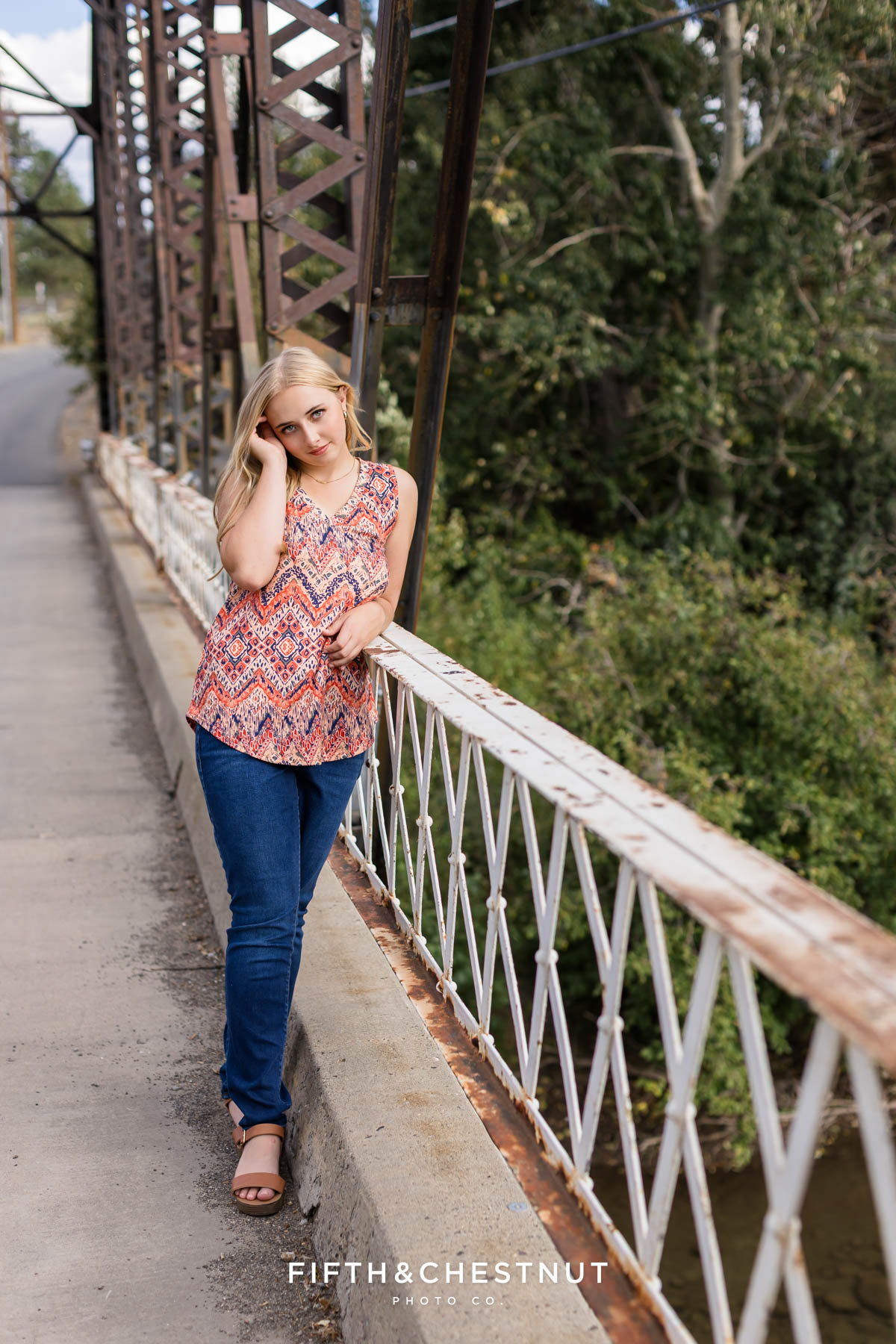 Next, we headed out toward Verdi to explore a few new spots. At the old bridge, Jordan wore a patterned tank with jeans, leaning into that effortless urban boho vibe. The mix of structure from the bridge and the natural scenery around it created such a cool contrast.