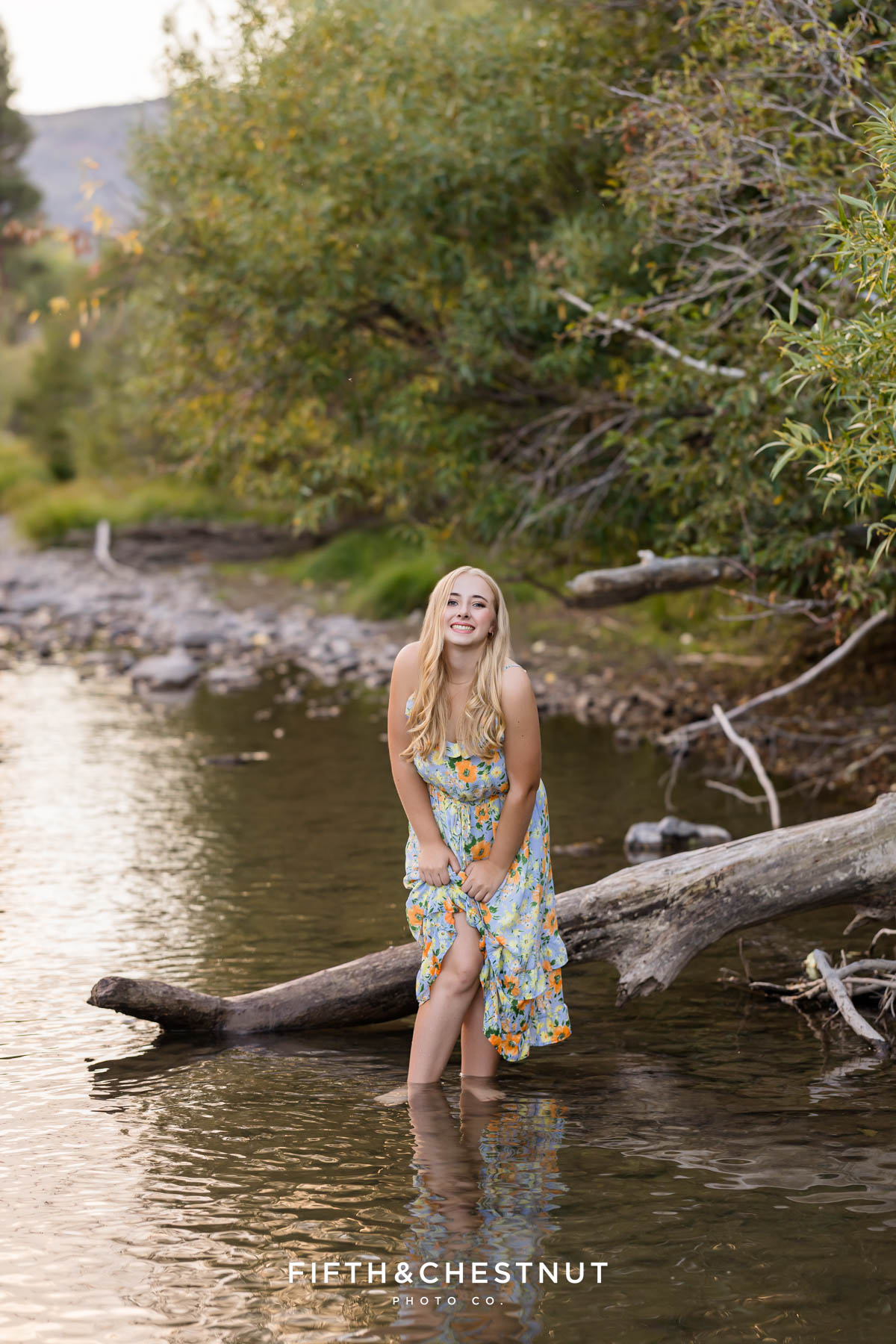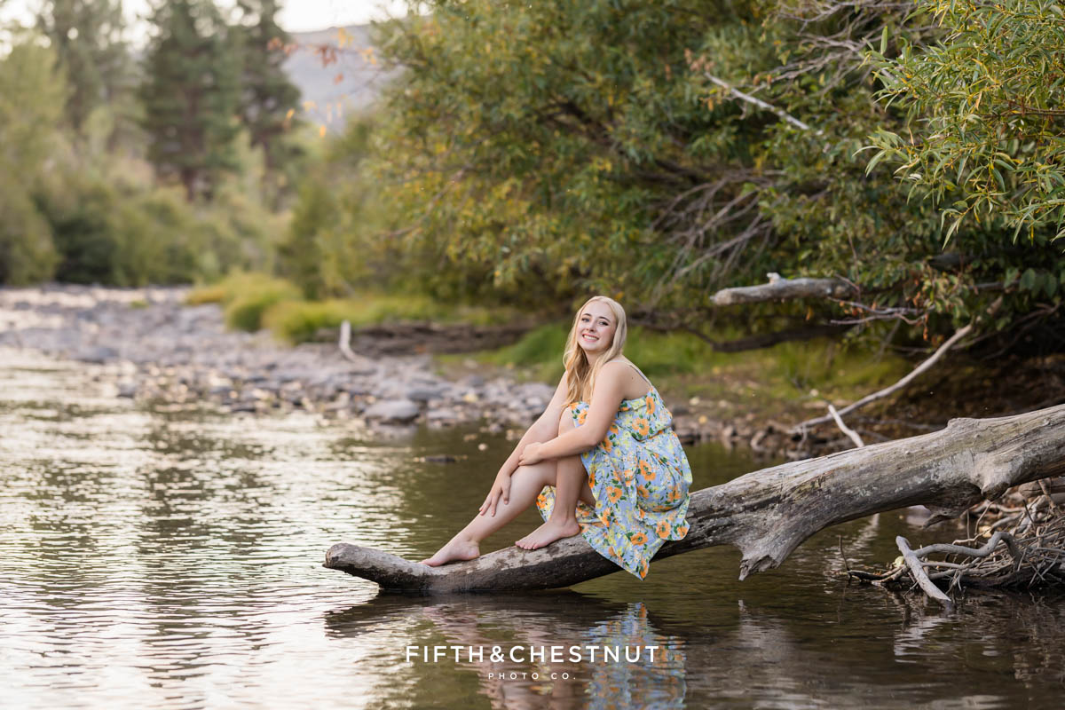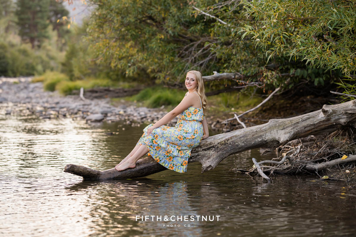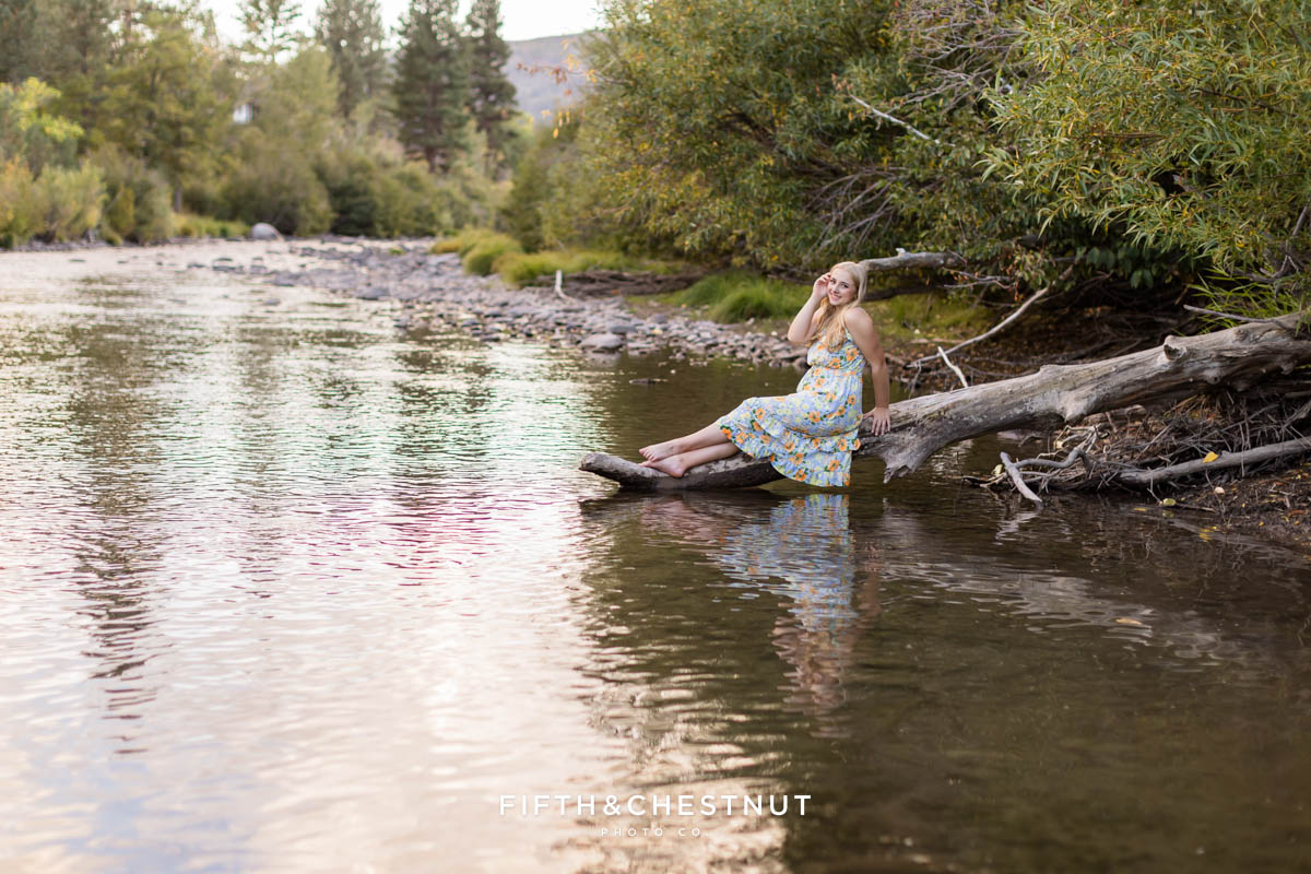 Then, we wrapped up the adventurous portion of Jordan’s Urban Boho Reno Senior Photos down by the river. She changed into a blue dress and we captured some carefree, natural portraits around the water. This part of the session definitely felt like an adventure. At the time, I had a sprained ankle, so walking in the river over slippery rocks was a little wild for me. Jordan, of course, handled it with ease. Her adventurous spirit and positive attitude made it all worth it!