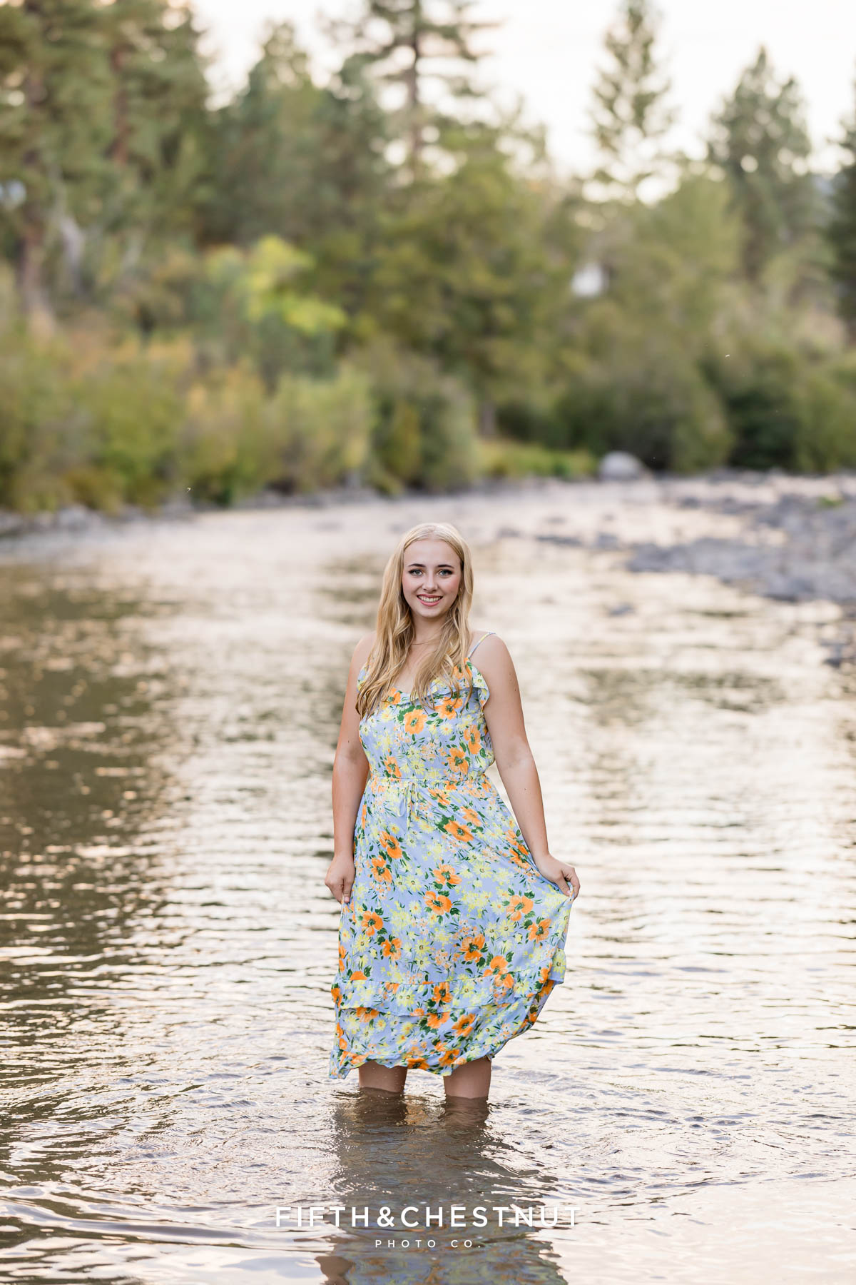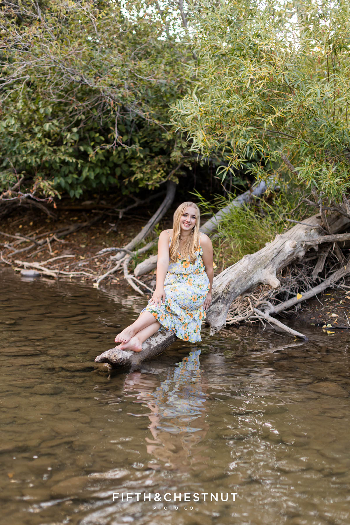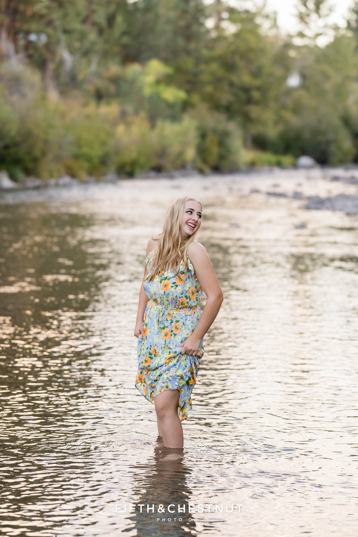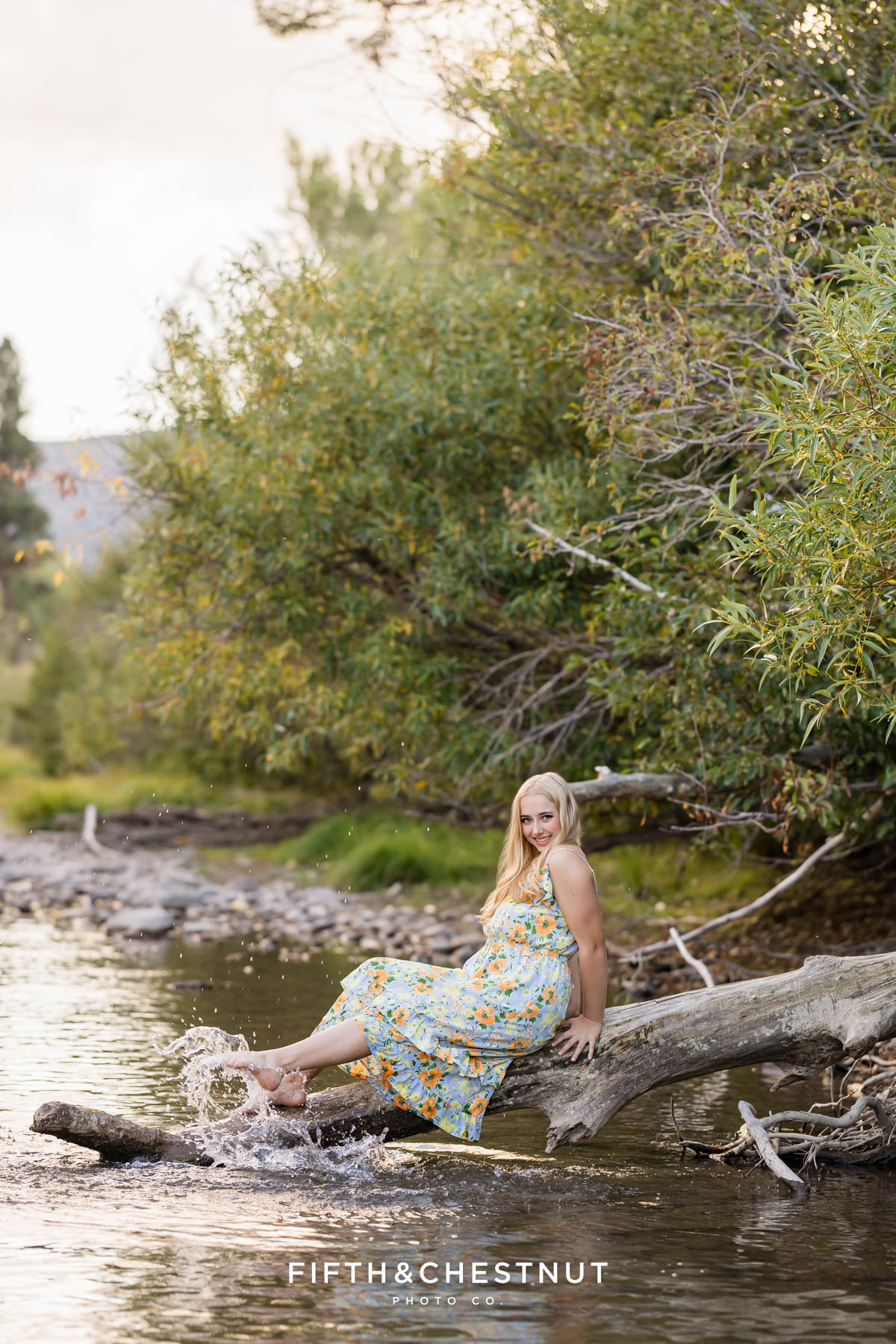 Then, we wrapped up the adventurous portion of Jordan’s Urban Boho Reno Senior Photos down by the river. She changed into a blue dress and we captured some carefree, natural portraits around the water. This part of the session definitely felt like an adventure. At the time, I had a sprained ankle, so walking in the river over slippery rocks was a little wild for me. Jordan, of course, handled it with ease. Her adventurous spirit and positive attitude made it all worth it!