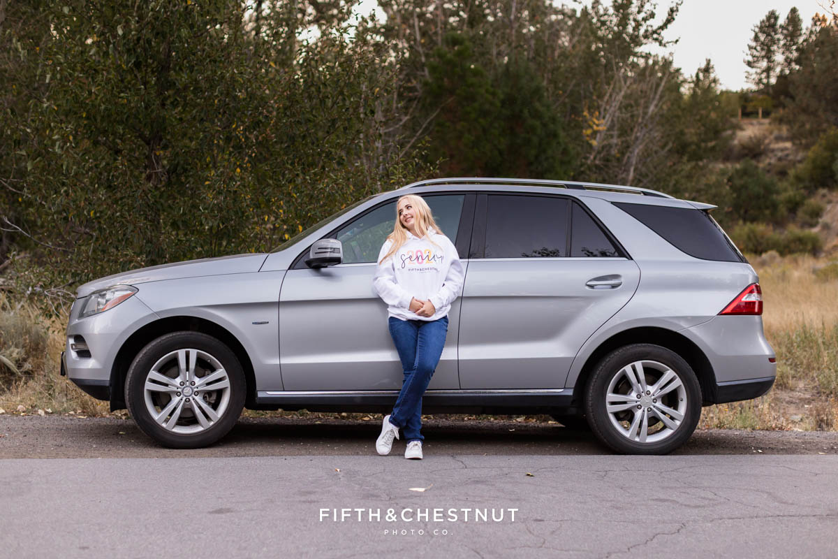 For the final portion of her session, Jordan wore her Fifth and Chestnut Senior VIP Team hoodie. We finished up by her car, which felt like the perfect way to close out such a fun and personal senior session. I am so glad Jordan is part of the Senior VIP Team. I absolutely love getting to photograph seniors like her!