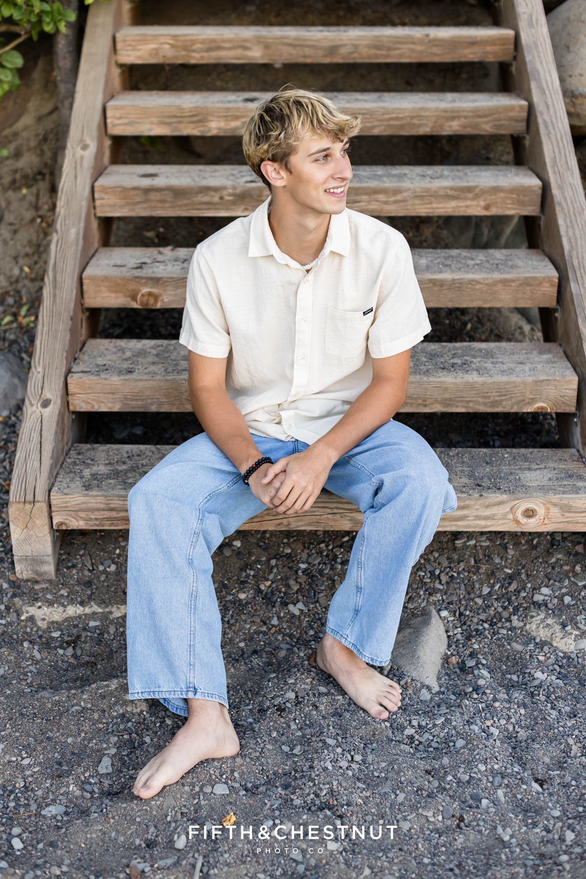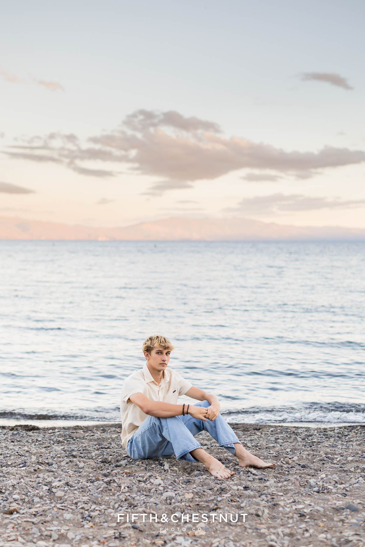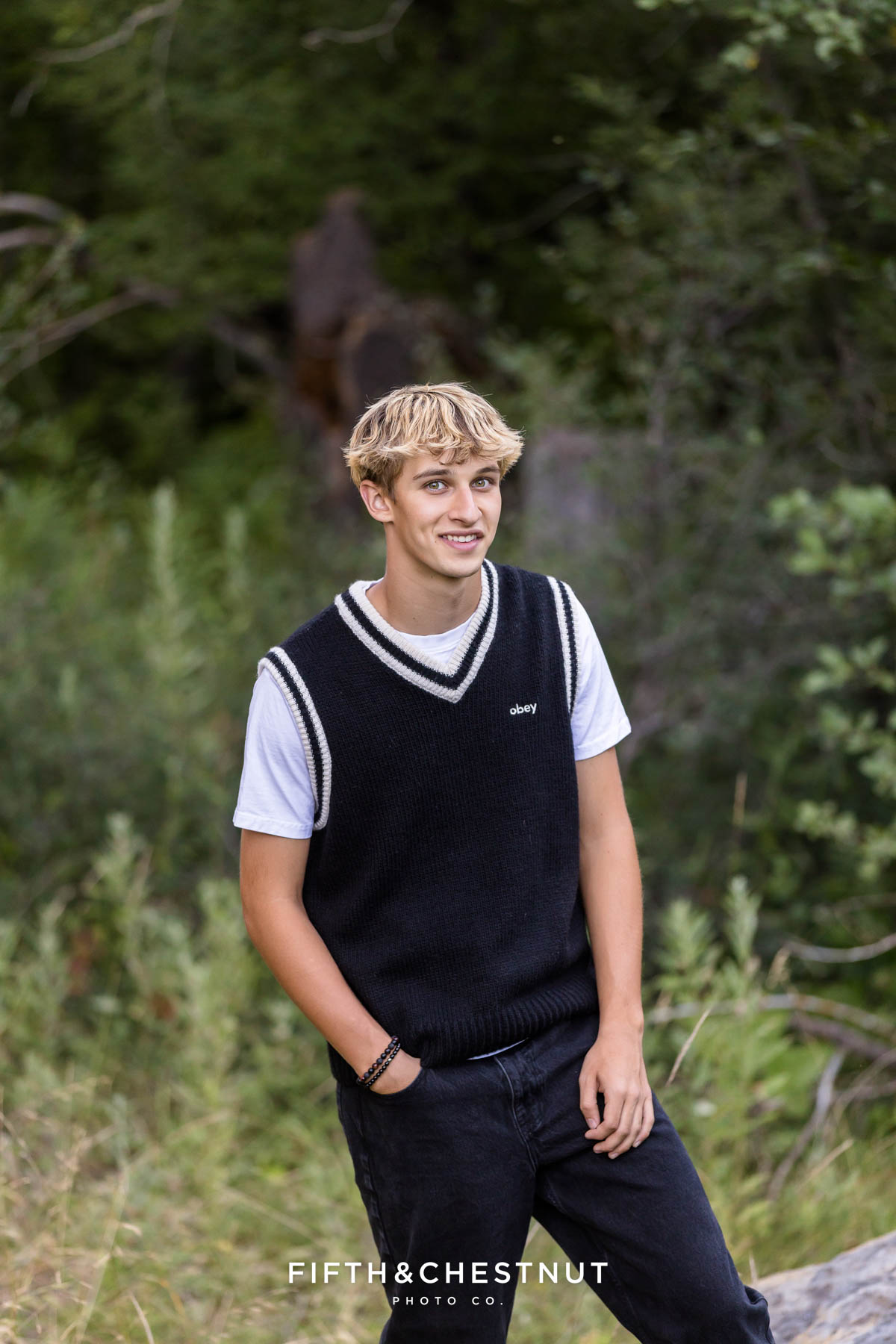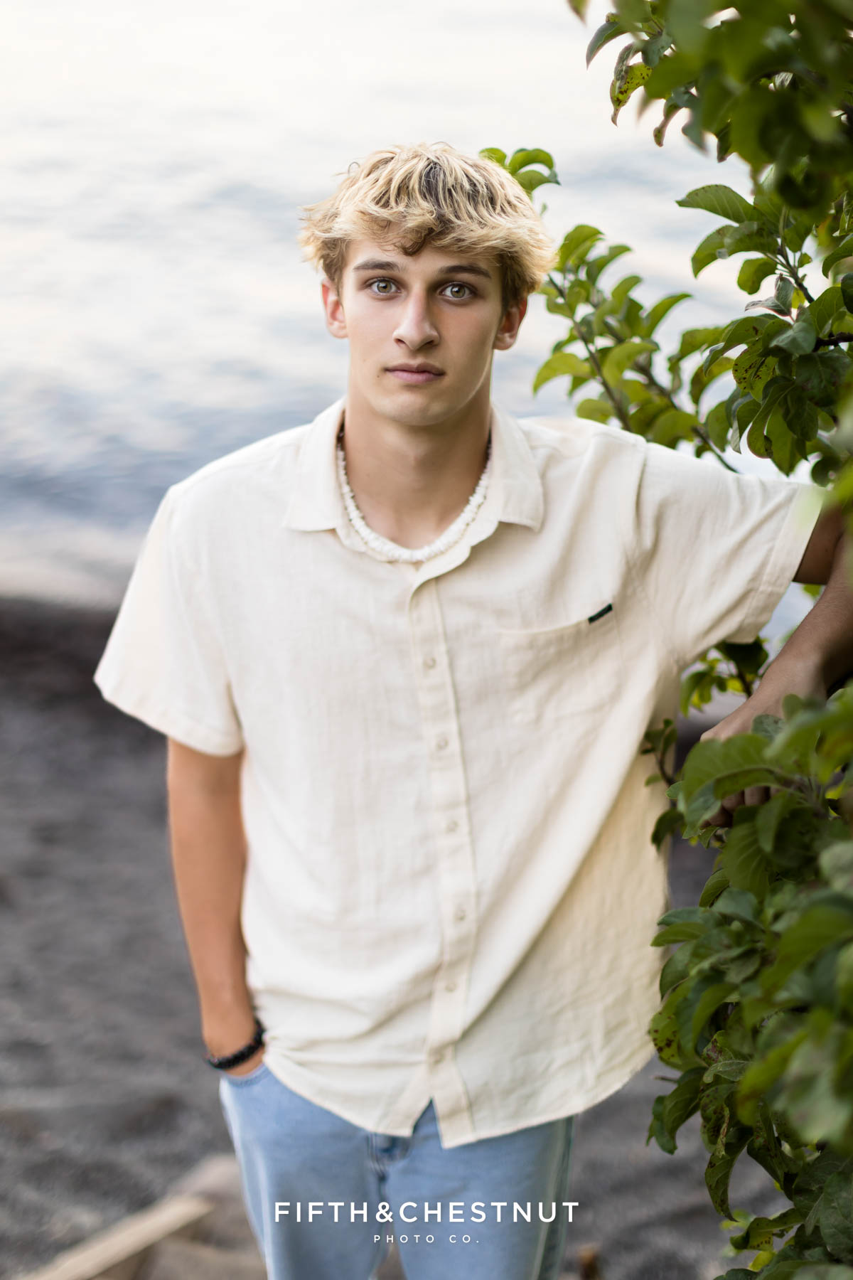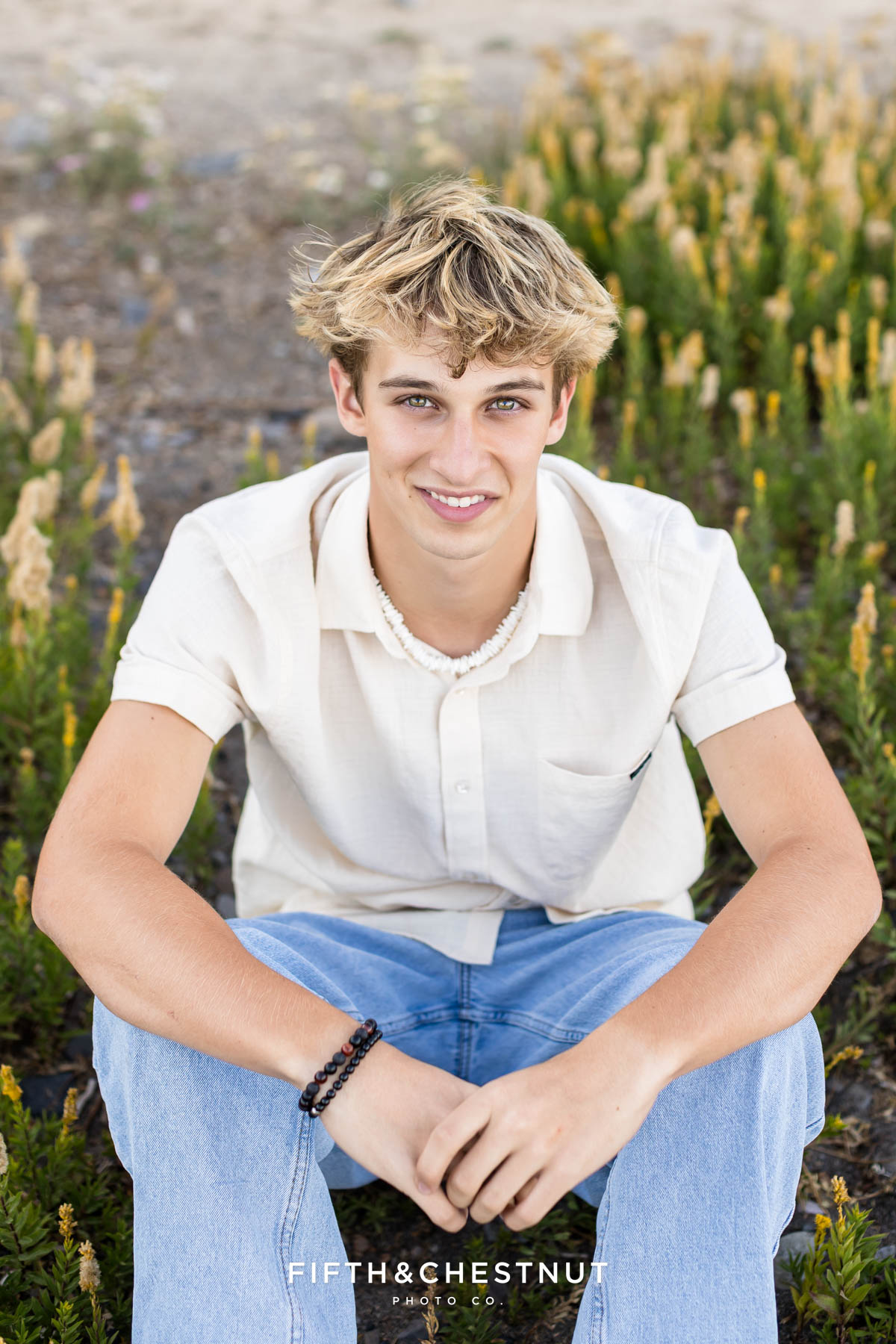 This senior brought two totally different outfits and both fit the scenery perfectly. His black and white look worked great against the natural green and brown tones of the forest. Then, the light-colored shirt and relaxed denim jeans matched the soft coastal colors of the beach at sunset. When a location allows for that much contrast in background and feel, it gives your final portraits so much depth and personality.