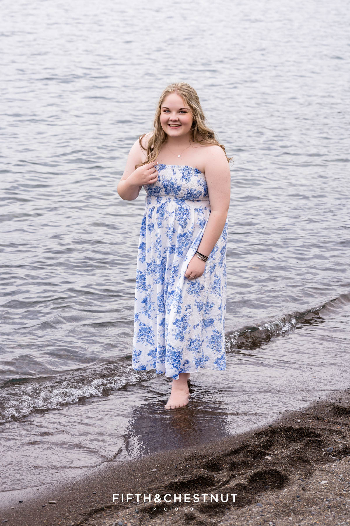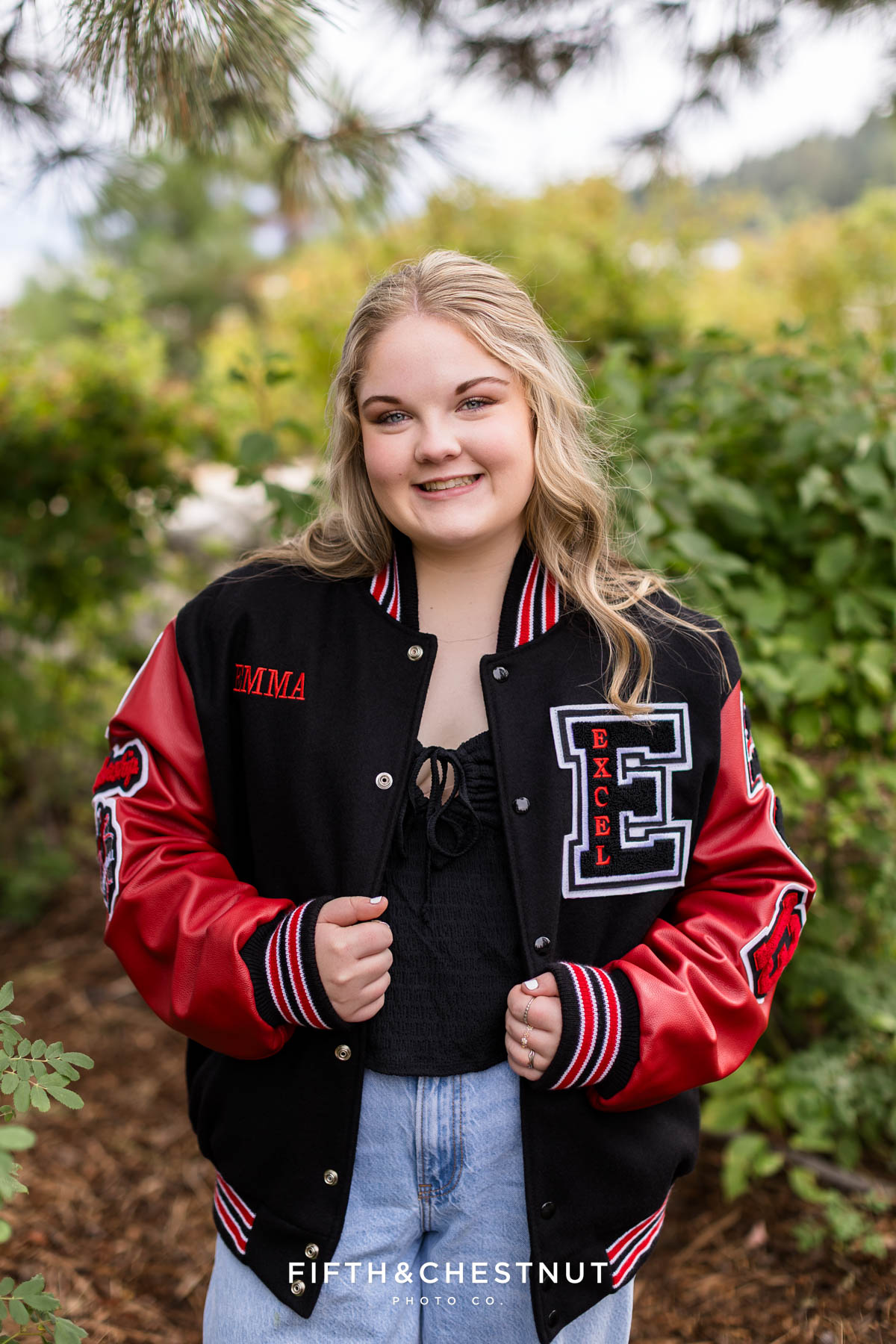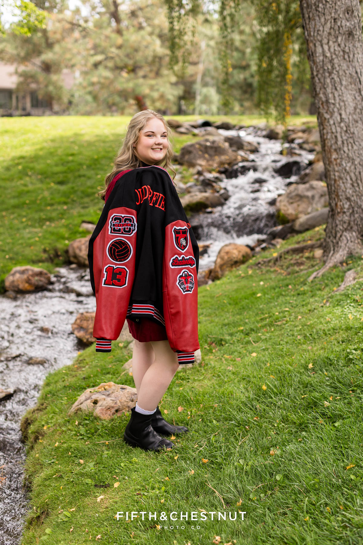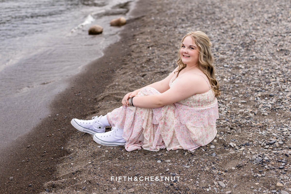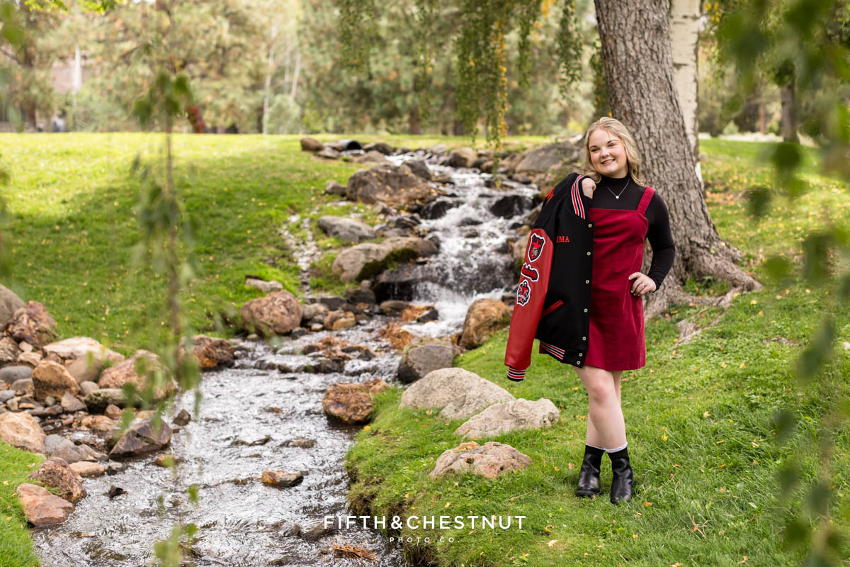 Emma brought so much personality to her session. She wore the cutest dresses – each one with soft textures and colors that photographed beautifully. Whether she was standing confidently in her black and red letterman jacket or twirling by the water in a tiered floral dress, her style choices helped tell her senior story in a truly authentic way.