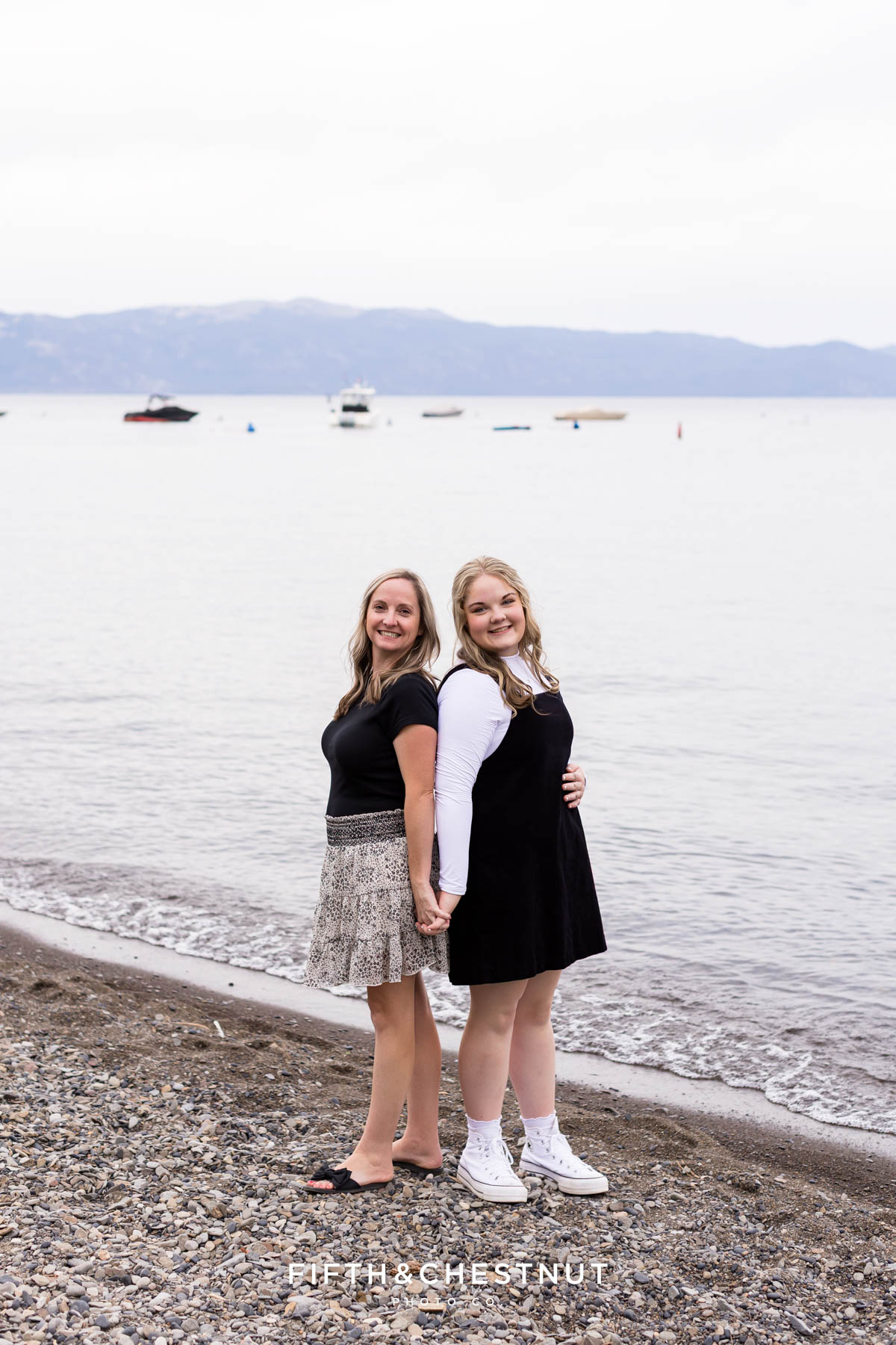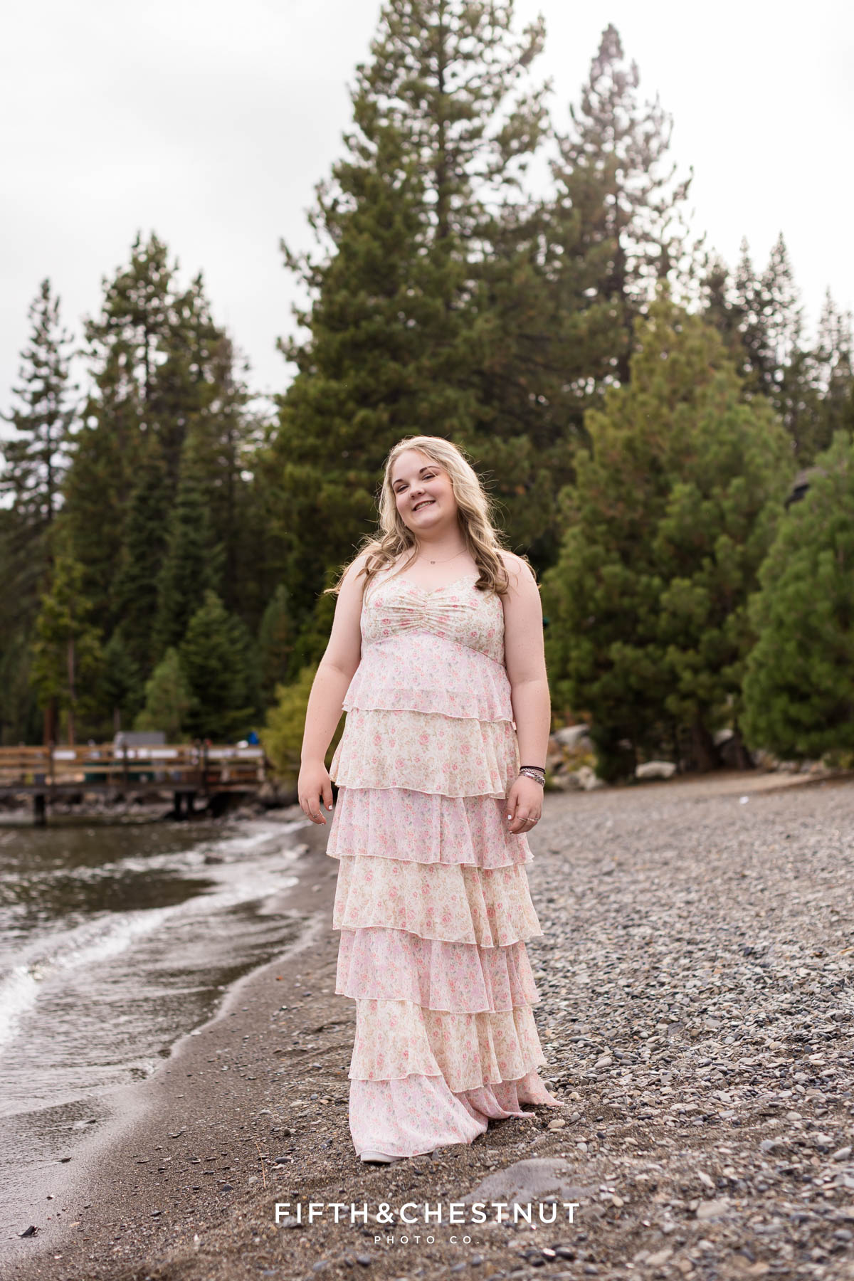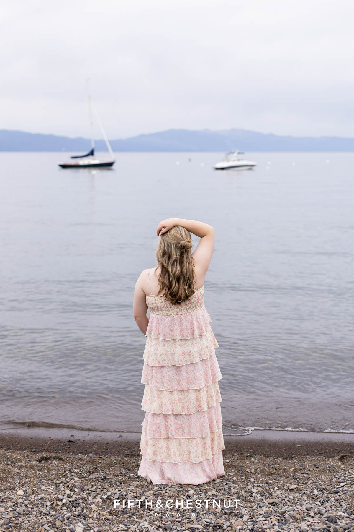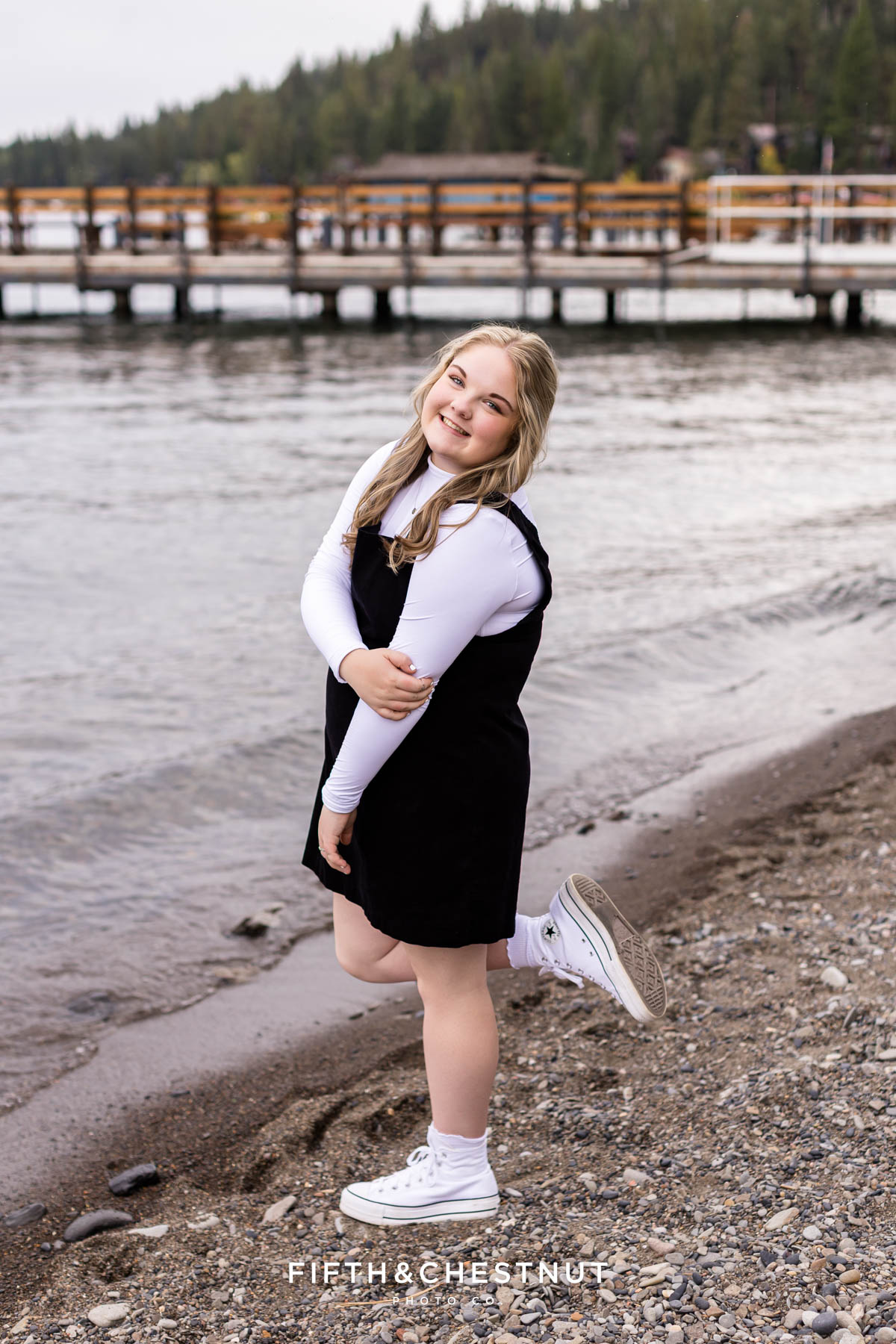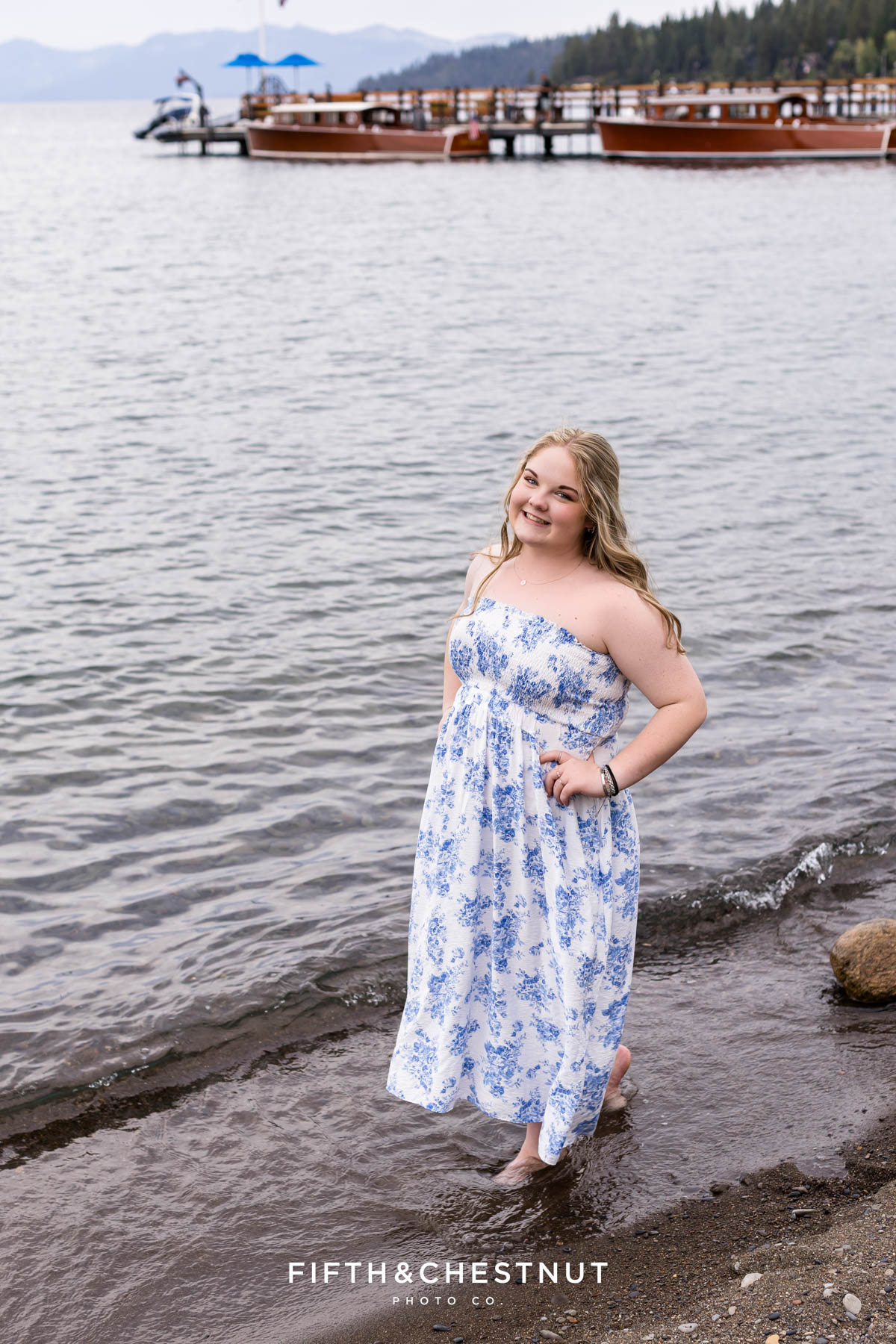 Later in the session, we headed up to Carnelian Bay at Lake Tahoe. Despite the clouds, the light was soft and dreamy. Emma even dipped her toes in the water – such a fun way to end the day! The dock, boats, and calm lake water created a peaceful setting for her final look of the evening. She even made a friend with the sweetest duck!